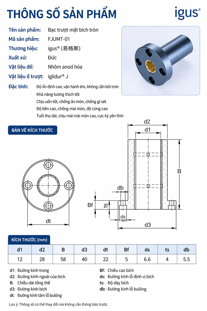 Bạc trượt tuyến tính IGUS FJUMT-01/02 là dòng bạc trượt khô (dry bearing) tích hợp mặt bích, dùng cho chuyển động tịnh tiến trên trục tròn, phù hợp các hệ thống tự động hóa, máy CNC, thiết bị đóng gói, in ấn và cơ khí chính xác. Sản phẩm có hai kiểu mặt bích: tròn (FJUMT-01) và vuông (FJUMT-02), giúp linh hoạt lắp đặt theo kết cấu máy.