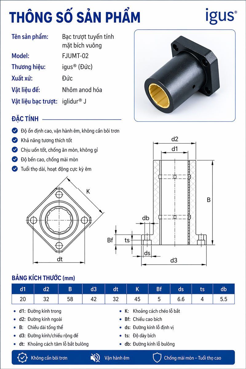 Bạc trượt IGUS FJUMT-01/02 là giải pháp thay thế hiệu quả cho bạc bi truyền thống trong các ứng dụng cần độ tin cậy cao, bảo trì thấp và chi phí vận hành tối ưu.