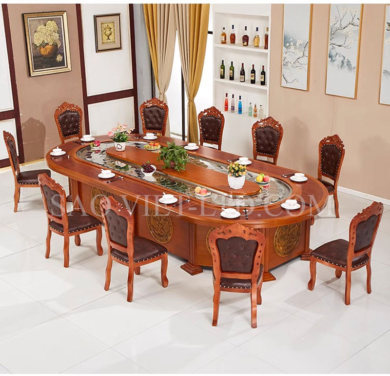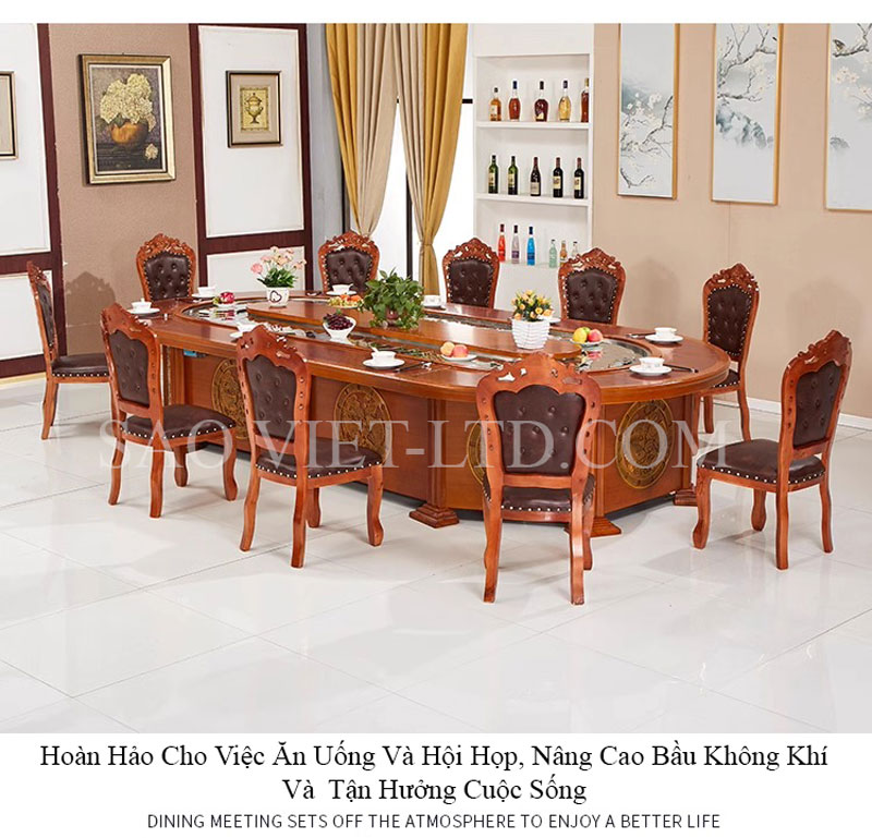 - Ứng dụng linh hoạt: Bộ bàn ăn BA02 thích hợp với nhiều không gian cao cấp như phòng tiệc, hội nghị, nhà hàng hoặc phòng ăn lớn tại gia đình. Với sự kết hợp giữa công nghệ băng tải tự động và thiết kế bầu dục thoải mái, mẫu bàn này đảm bảo sự tiện nghi và linh hoạt trong các bữa ăn đông người.