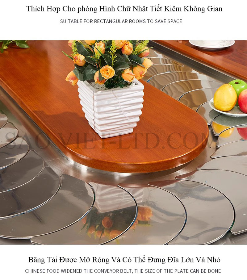 - Động cơ điện chất lượng cao: Hệ thống băng tải sử dụng động cơ điện chất lượng cao, vận hành êm ái, không gây tiếng ồn, mang lại sự thoải mái và không gian yên tĩnh khi dùng bữa.