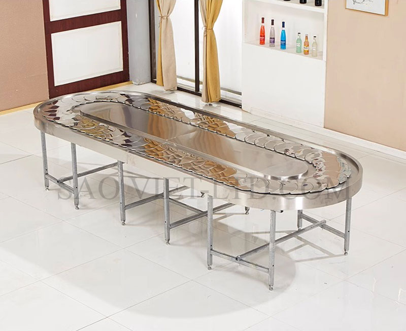 - Thiết kế băng tải độc đáo: Thay vì mâm xoay tròn truyền thống, BA02 được trang bị băng tải xoay tự động hình chữ nhật, giúp vận chuyển các món ăn dọc theo chiều dài bàn một cách mượt mà. Băng tải này cho phép người ngồi ở bất kỳ vị trí nào cũng có thể dễ dàng lấy món ăn mình thích mà không cần với tay hay nhờ người khác.