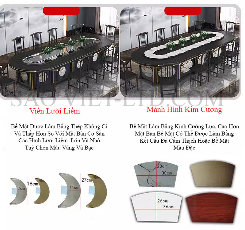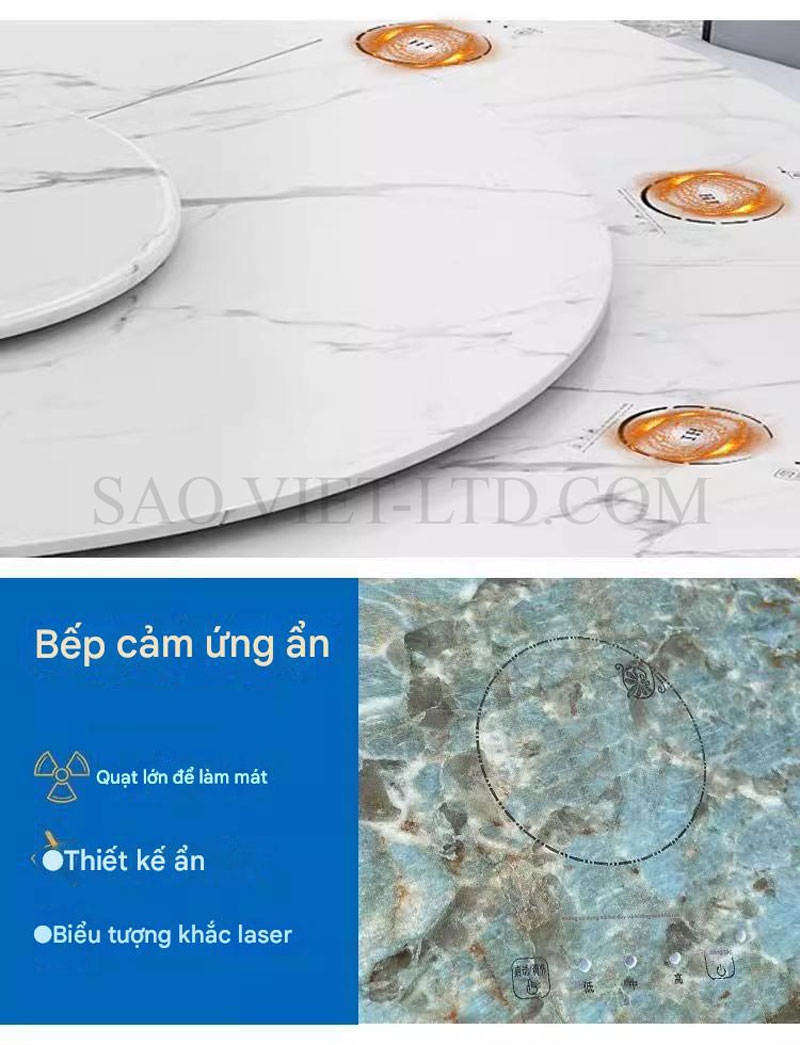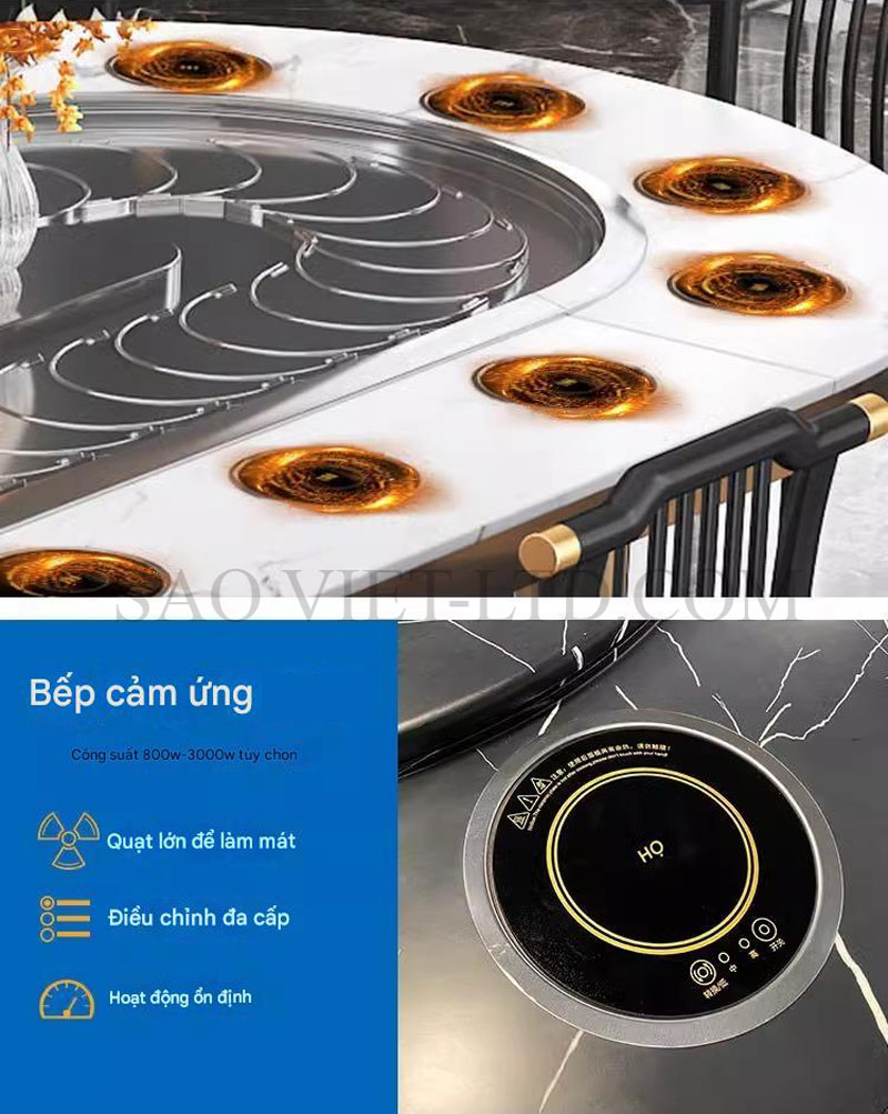 Tích hợp bếp từ lẩu: Mặt bàn có các khoang được thiết kế để lắp đặt bếp từ hoặc bếp lẩu âm bàn, giúp tiện lợi cho việc thưởng thức các món lẩu hay nấu ngay tại bàn mà không làm ảnh hưởng đến thẩm mỹ chung.