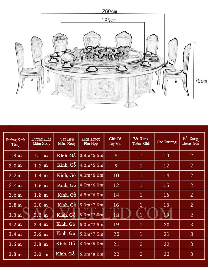 - Mẫu BA03 có nhiều kích thước khác nhau phù hợp với các bàn ăn từ 8 đến 12 người, đáp ứng các buổi tiệc lớn hoặc các bữa ăn gia đình sang trọng.