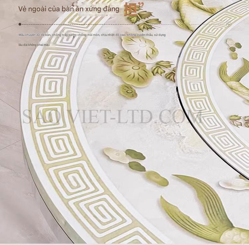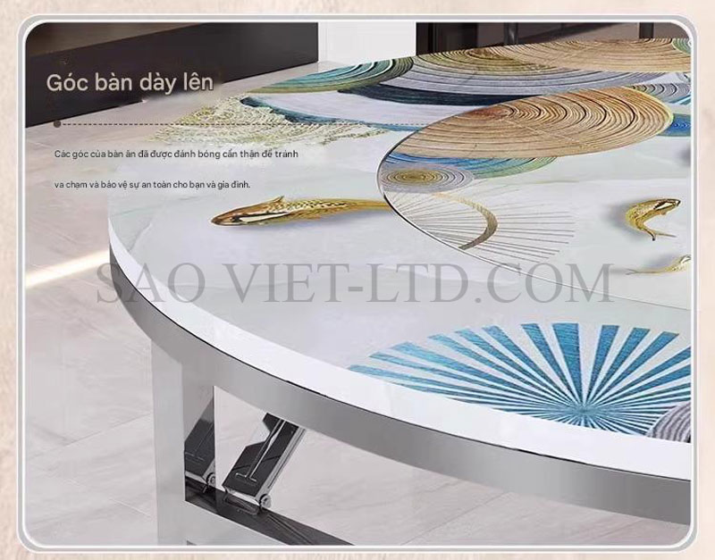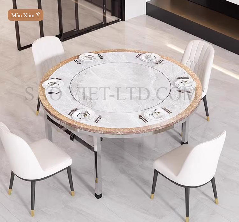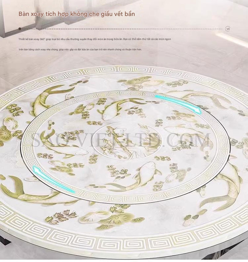 - Mặt bàn xoay tròn 360 độ: Phần trung tâm của bàn có một mặt bàn xoay, cho phép người dùng dễ dàng xoay thức ăn hoặc đồ dùng trên bàn mà không cần di chuyển, giúp các thành viên dễ dàng chia sẻ món ăn mà không làm gián đoạn bữa ăn.