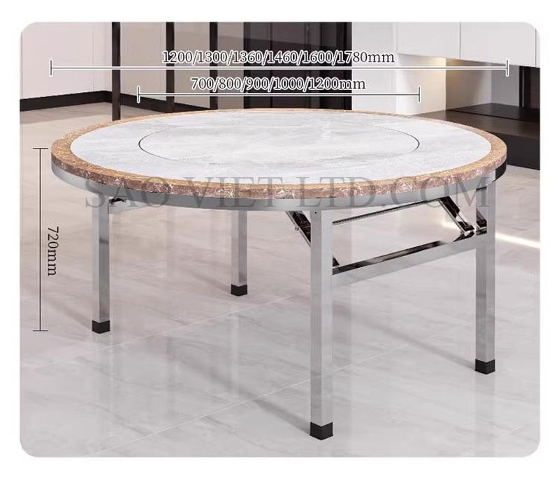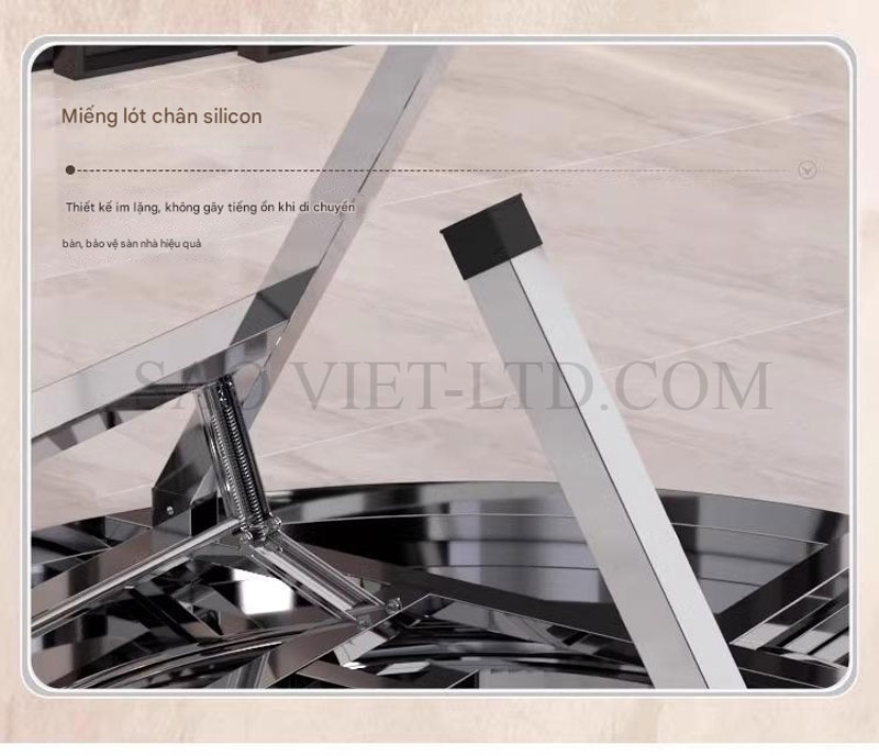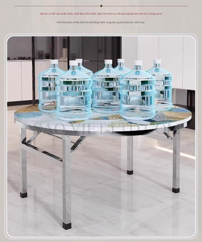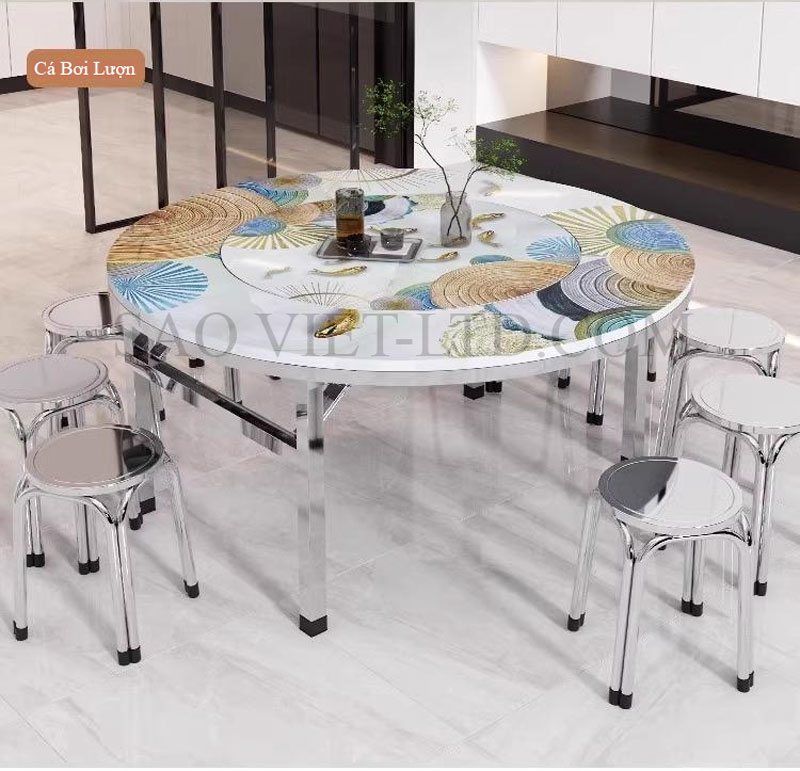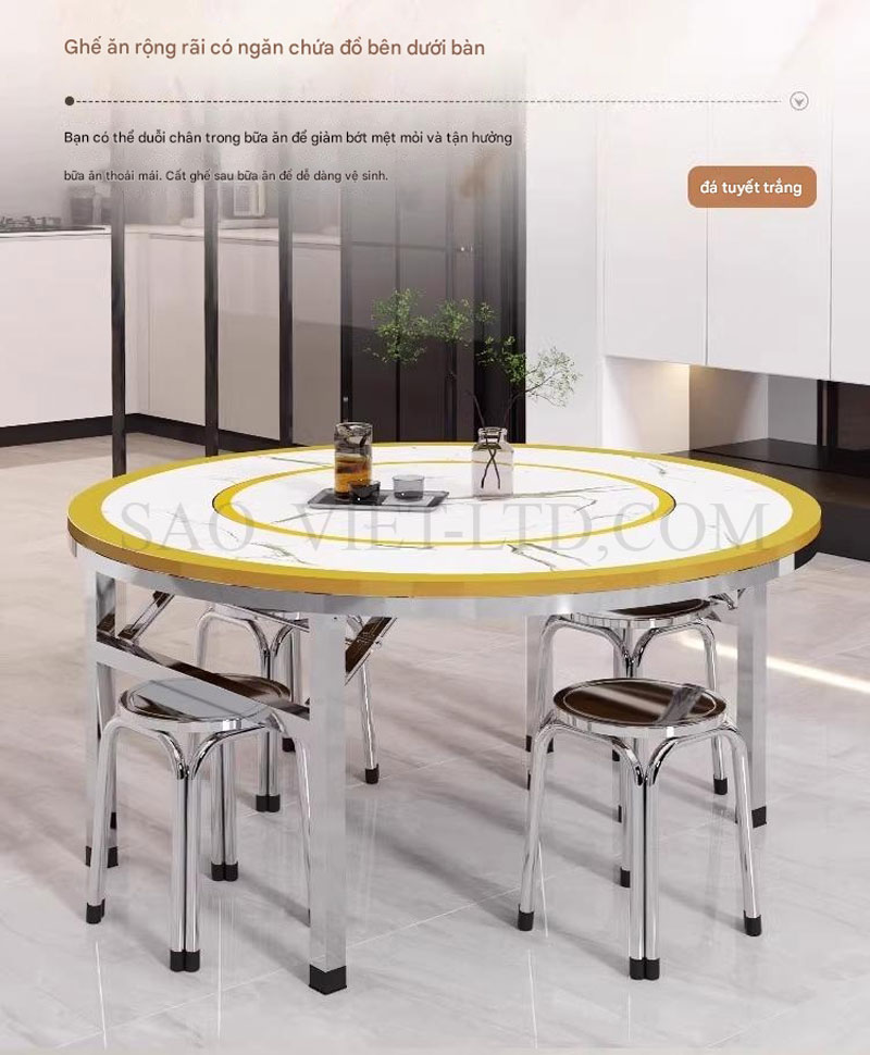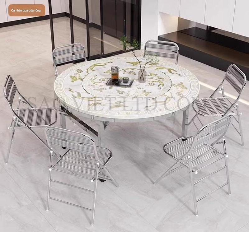Bàn ăn tròn inox mặt bàn xoay 360 độ chân gập là một sản phẩm tiện lợi và hiện đại, được thiết kế đặc biệt để phù hợp với không gian sống linh hoạt và tối ưu hóa diện tích sử dụng. Đây là lựa chọn lý tưởng cho các gia đình và nhà hàng với phong cách bày trí gọn gàng, thanh lịch. Dưới đây là mô tả chi tiết về loại bàn này: