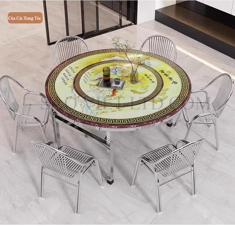Tóm lại, bàn ăn tròn inox với mặt bàn xoay 360 độ và chân gập là một sản phẩm đa dụng, thẩm mỹ và tiện ích. Thiết kế này đáp ứng nhu cầu sử dụng linh hoạt, phù hợp cho cả gia đình và nhà hàng, góp phần làm cho bữa ăn trở nên tiện lợi và thoải mái hơn.