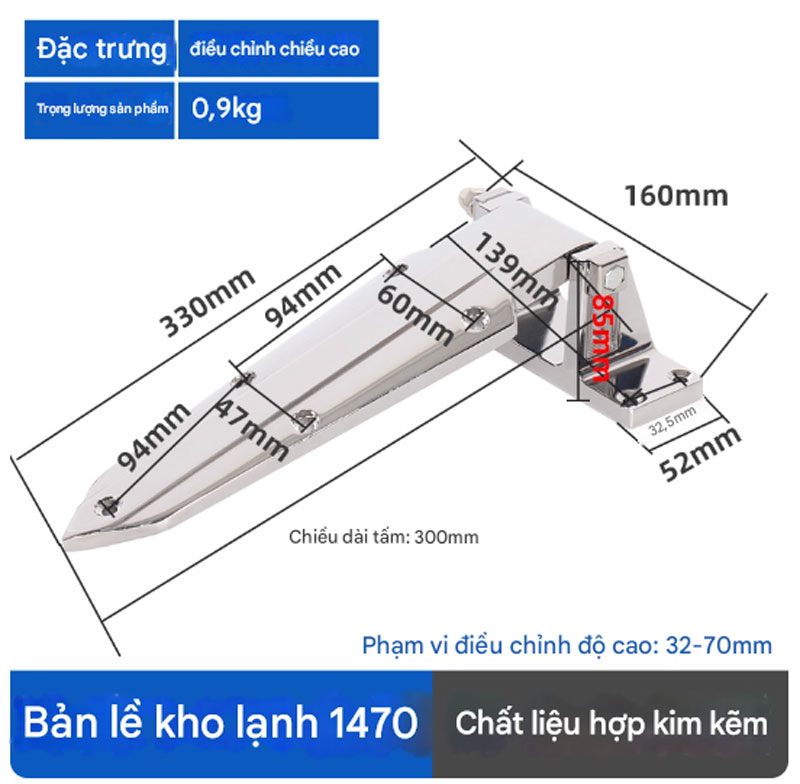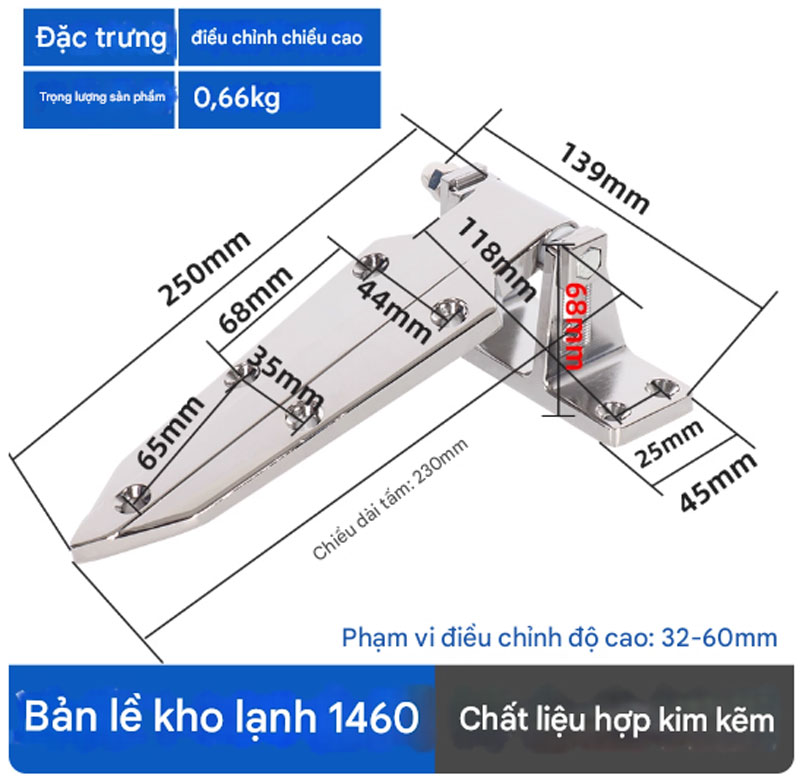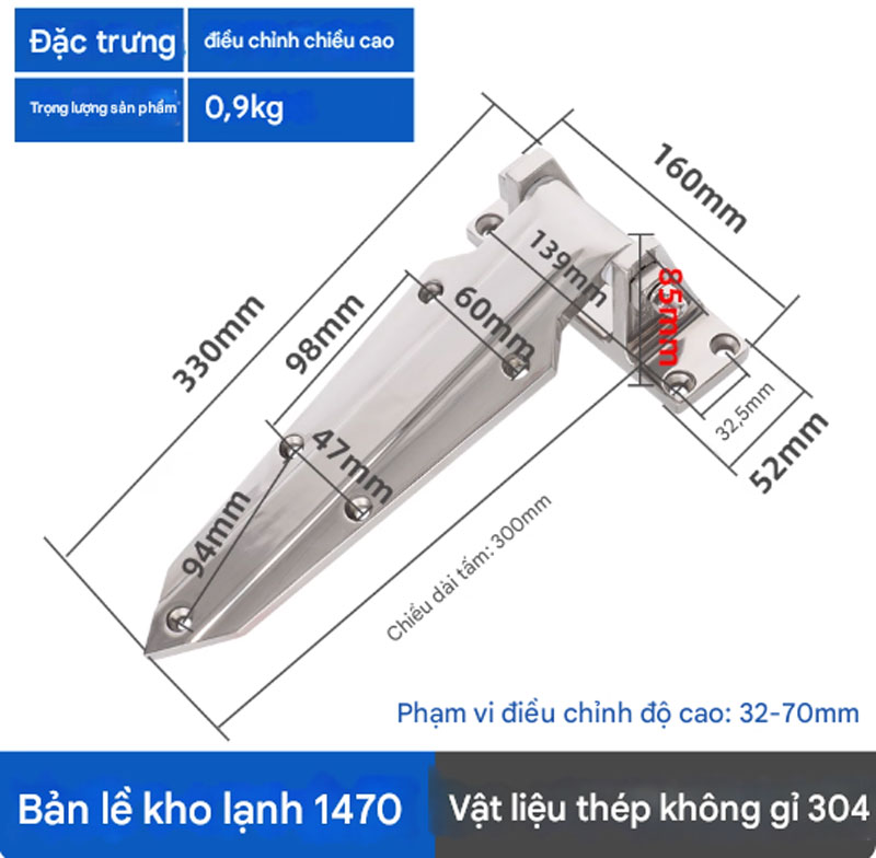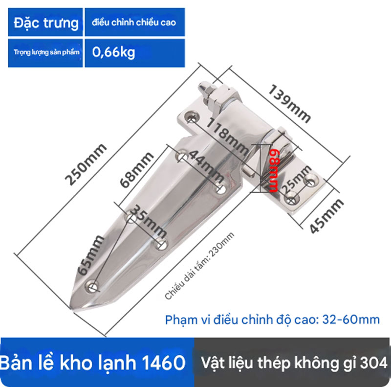 Bản lề cửa kho lạnh 1460 là loại bản lề công nghiệp chuyên dụng được thiết kế cho các hệ thống cửa yêu cầu độ bền cao, khả năng chịu nhiệt – chịu lạnh tốt và hoạt động ổn định trong môi trường khắc nghiệt. Sản phẩm được chế tạo bằng inox chống gỉ hoặc thép không gỉ mạ cao cấp, giúp chống ăn mòn, chịu ẩm và duy trì tuổi thọ lâu dài ngay cả trong môi trường nhiệt độ âm sâu hoặc nhiệt độ cao.