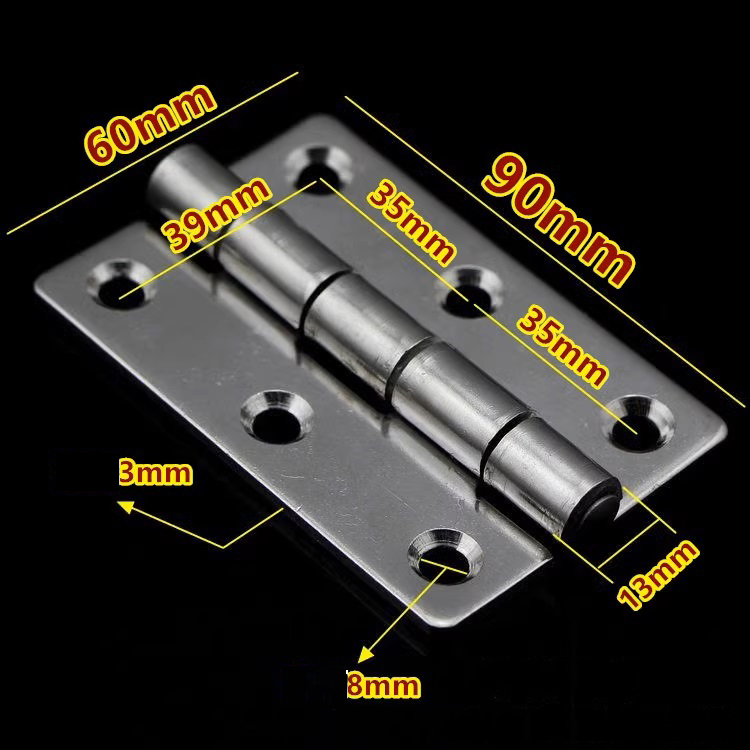 Bản lề Inox 304 kích thước 60*90mm, dày 3mm, là một loại bản lề chất lượng cao, thường được sử dụng cho cửa gỗ, cửa sắt, và các loại cửa khác