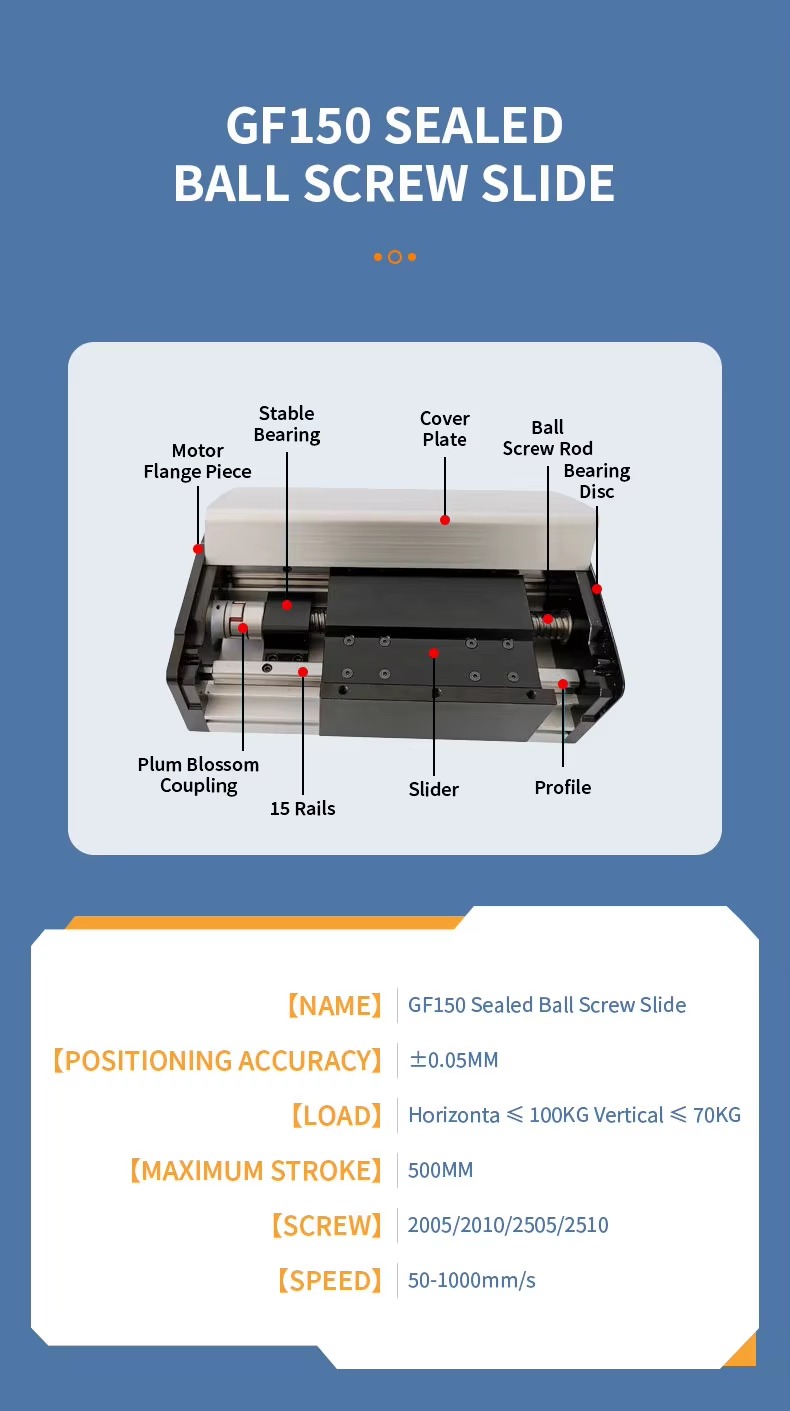 Bàn trượt bi-me GF150 là dòng bàn trượt tuyến tính hạng nặng, sử dụng vít me bi chính xác cao kết hợp ray trượt đôi, được thiết kế lắp kín hoàn toàn nhằm chống bụi, phoi kim loại và dầu cắt trong môi trường CNC.