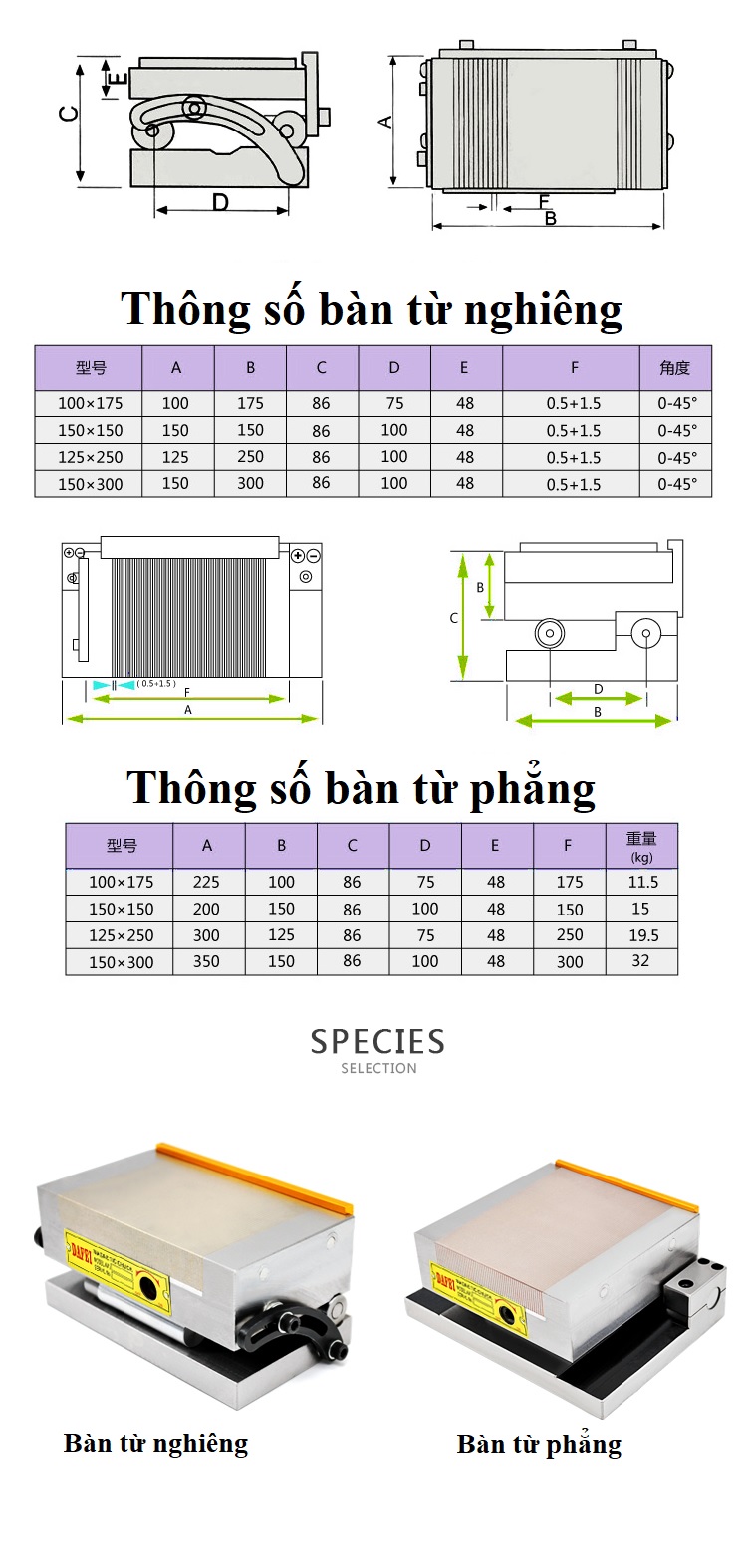 - Với loại bàn nghiêng này có ba kiểu dáng kích cỡ khác nhau bạn có thể xem thông số chính xác tại bảng trên để tìm sản phẩm phù hợp với nhu cầu gia công của bạn.