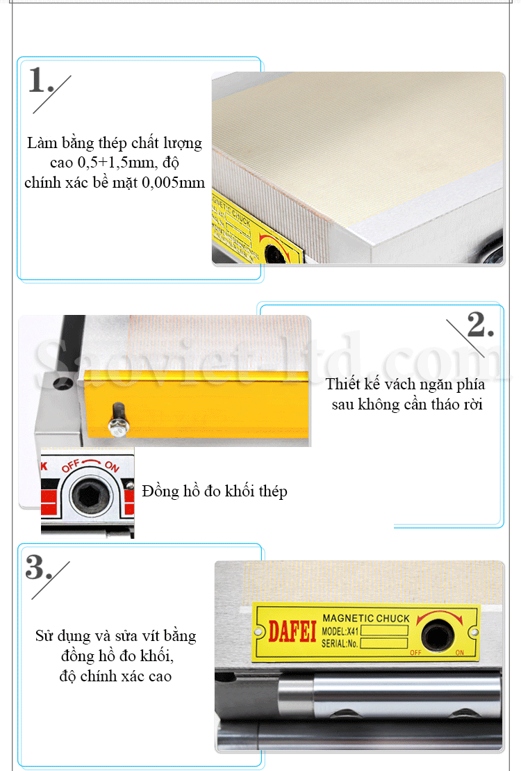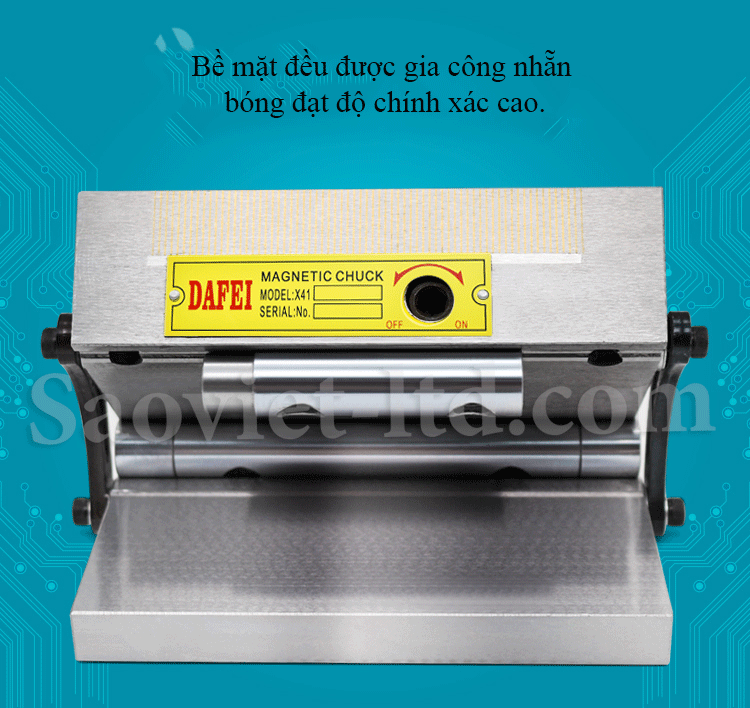- Lực từ tính để gá đặt đạt 700 GAUSS, bước cực từ kẹp rất nhỏ khoảng 2.5(1+1.5) giúp bạn kẹp chi tiết với lực kẹp chắc chắn, cứng vững cực cao tránh bị sai lệch khi ra công.