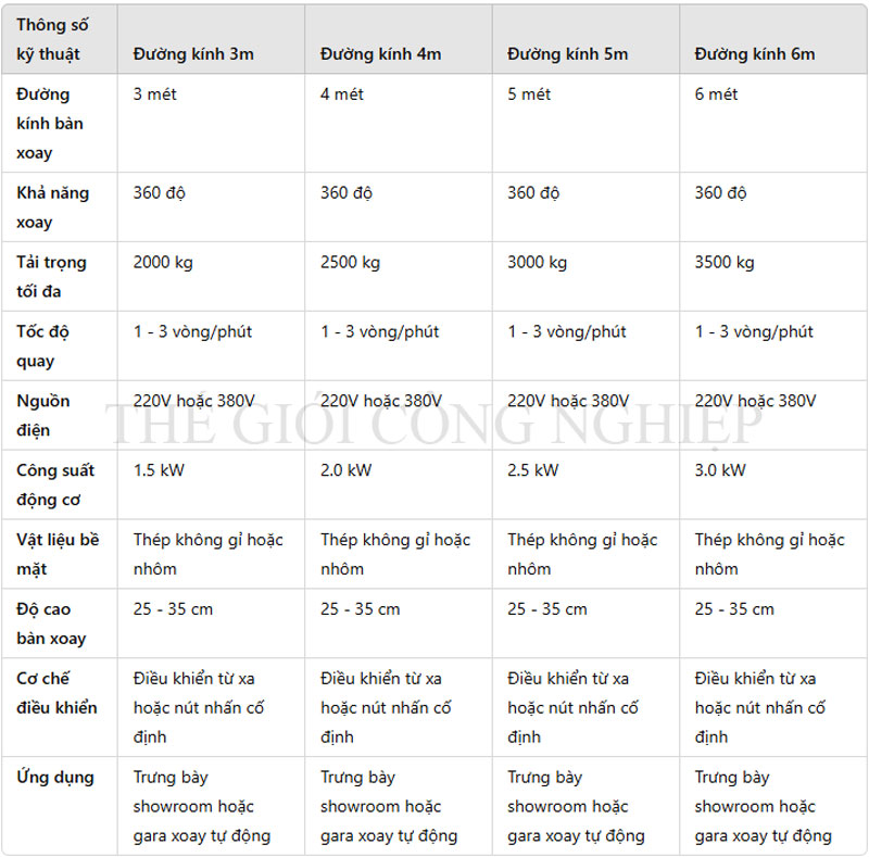 Tải trọng và Động cơ: Bàn xoay có khả năng chịu tải trọng từ 2000 kg (đối với đường kính 3 mét) đến 3500 kg (đối với đường kính 6 mét). Động cơ mạnh mẽ với công suất từ 1.5 kW đến 3.0 kW giúp bàn xoay hoạt động êm ái và trơn tru.
