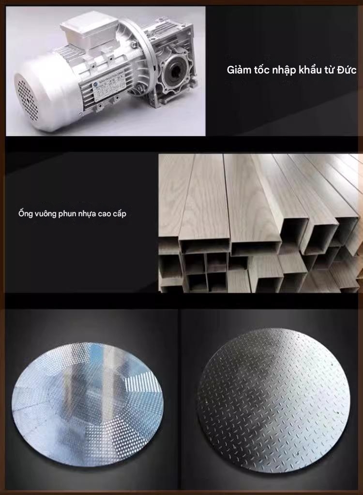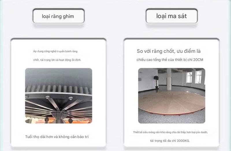Điều khiển và An toàn: Bàn xoay được trang bị hệ thống điều khiển từ xa và nút nhấn cố định. Người dùng có thể điều chỉnh tốc độ và hướng xoay linh hoạt theo ý muốn. Hệ thống còn có các cảm biến an toàn, tự động dừng khi gặp chướng ngại vật.