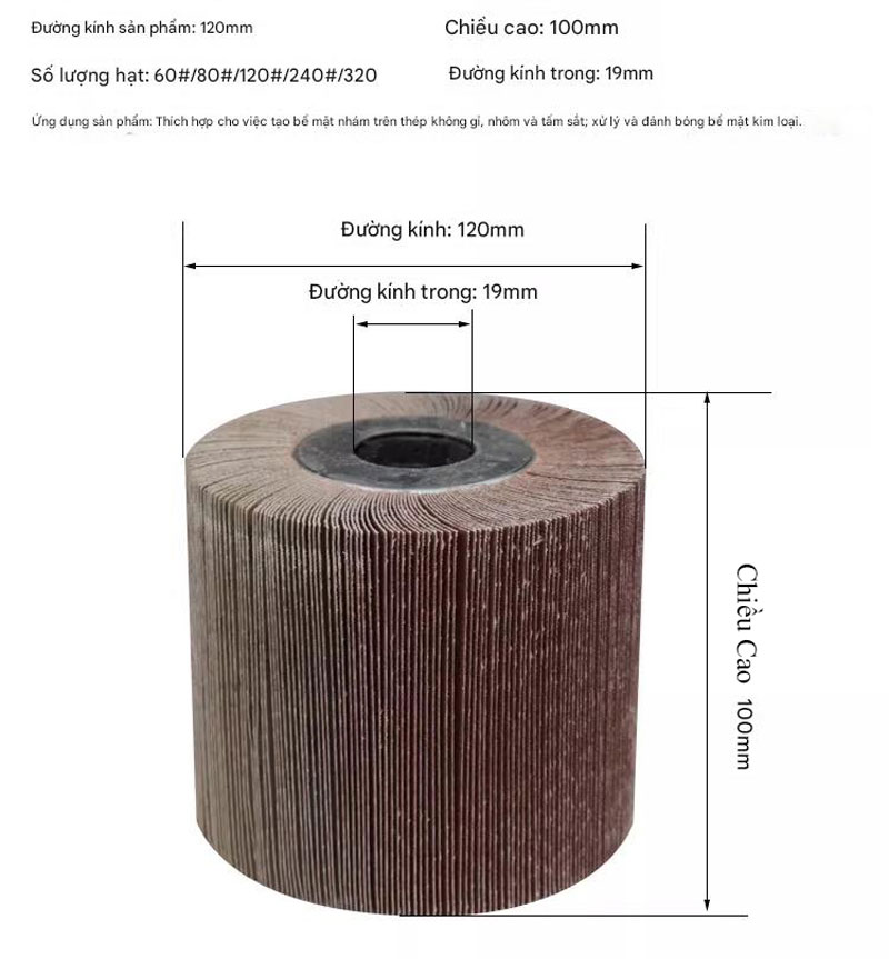 Bề mặt nhám có độ hạt đa dạng từ thô đến mịn (P60 – P600 hoặc cao hơn), cho phép thực hiện nhiều công đoạn như mài phá, xử lý ba via, làm sạch bề mặt, tạo độ nhẵn và đánh bóng hoàn thiện. Nhờ thiết kế dạng trụ, bánh nhám có khả năng tiếp cận tốt các vị trí khó như khe hẹp, rãnh sâu, góc cạnh hoặc bề mặt cong.