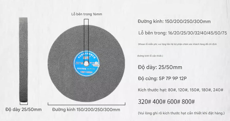 Sản phẩm tương thích với nhiều loại máy như máy đánh bóng cầm tay, máy mài, máy đánh bóng trục hoặc máy công nghiệp. Đường kính phổ biến gồm Ø150mm, Ø200mm, Ø250mm, đáp ứng đa dạng nhu cầu từ gia công thủ công đến sản xuất quy mô lớn.