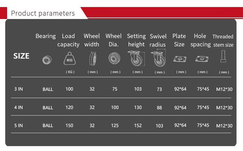 Thông số có thể thay đổi tùy nhà sản xuất; nếu bạn muốn mình làm bảng thông số chuẩn hơn, hãy cho biết loại càng (xoay / khóa / cố định) và kiểu gắn (bản mã / ren).