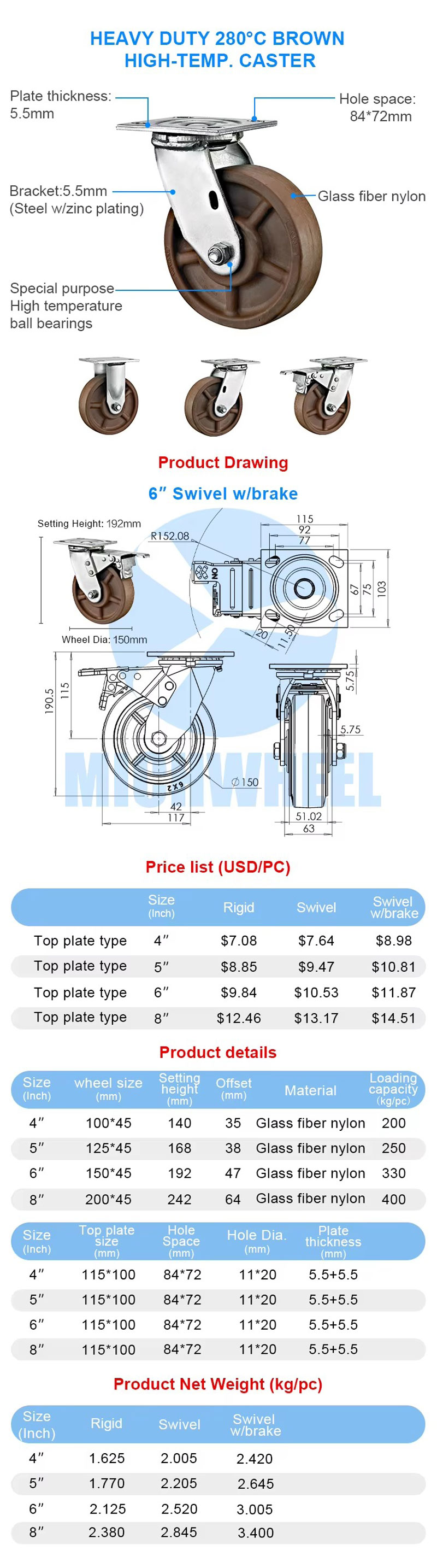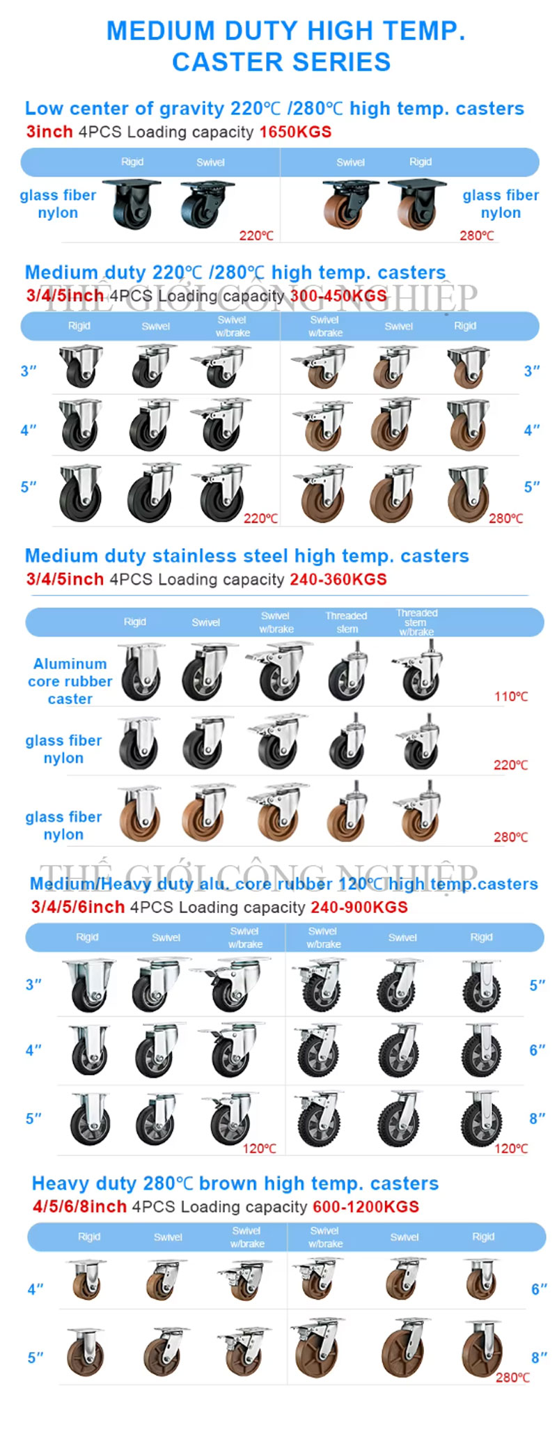 Mô tả chi tiết – Bánh xe chịu nhiệt độ cao 300°C – bánh xe công nghiệp nylon bền – xoay 360°