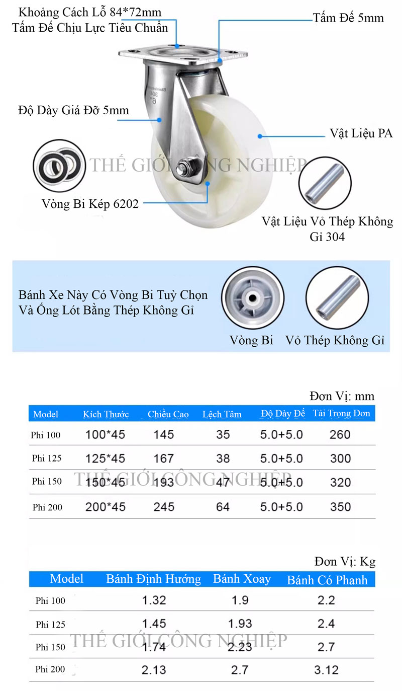 Mô tả chi tiết Bánh xe đẩy nhựa PA càng inox chịu tải cao phi 100, 125, 150, 200