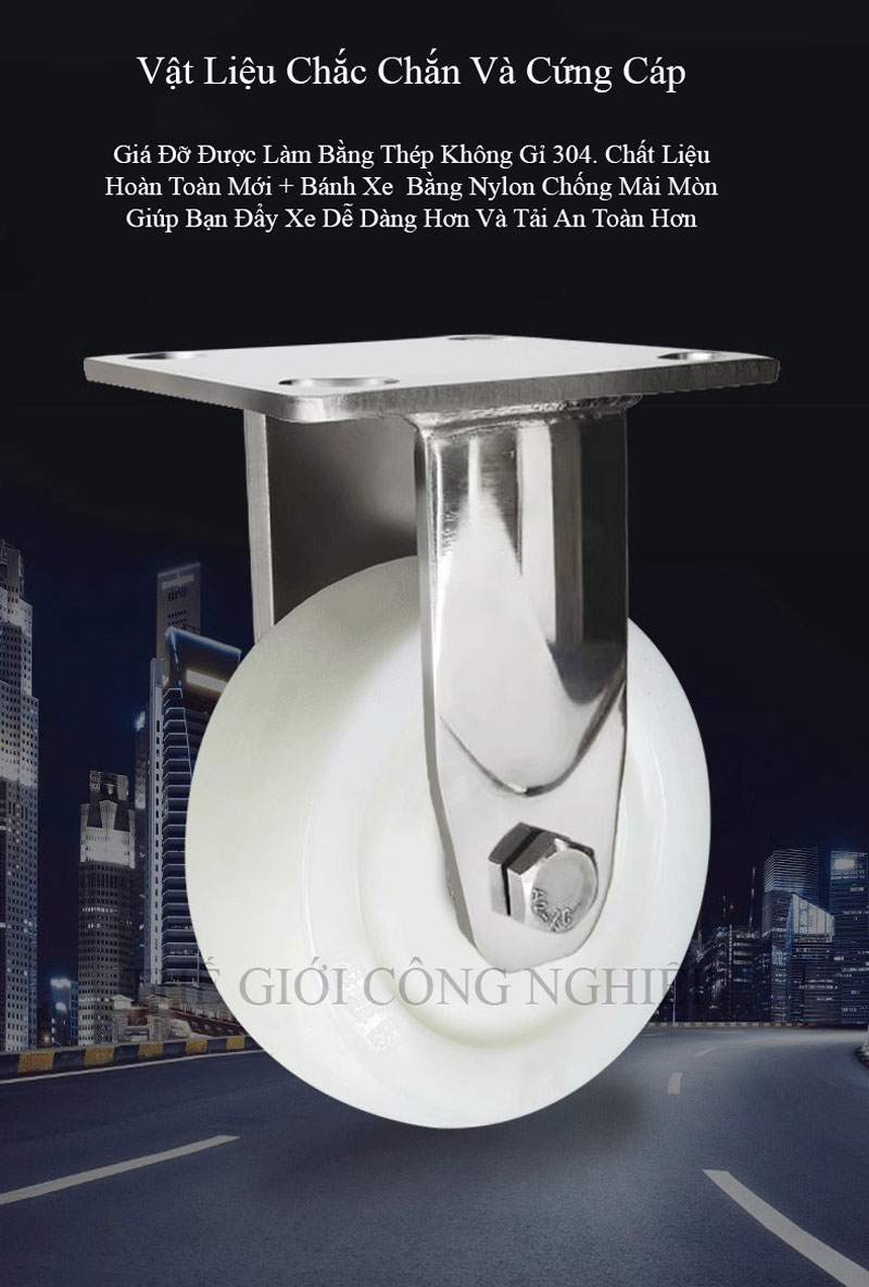 - Càng bánh xe: Sử dụng inox không gỉ có khả năng chống ăn mòn, phù hợp với môi trường ẩm ướt, hóa chất hoặc yêu cầu vệ sinh cao như thực phẩm, y tế.