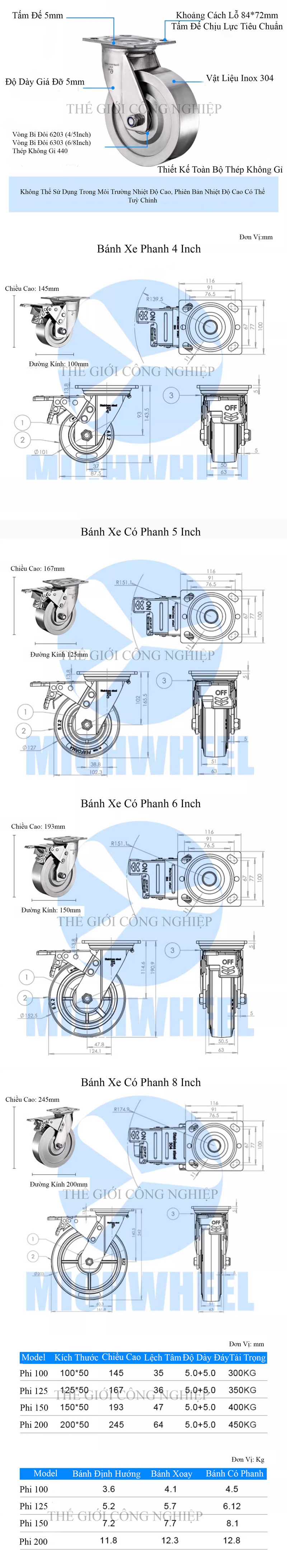 - Phi 150mm: Chịu tải khoảng 350 - 400kg/bánh.