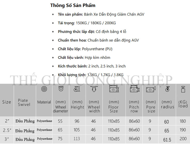 | Kích thước bánh | 2 inch / 2.5 inch / 3 inch |