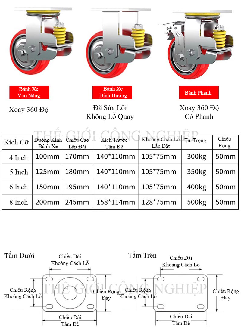 - Đường kính bánh xe (phi): 100mm, 125mm, 150mm, 180mm, 200mm.