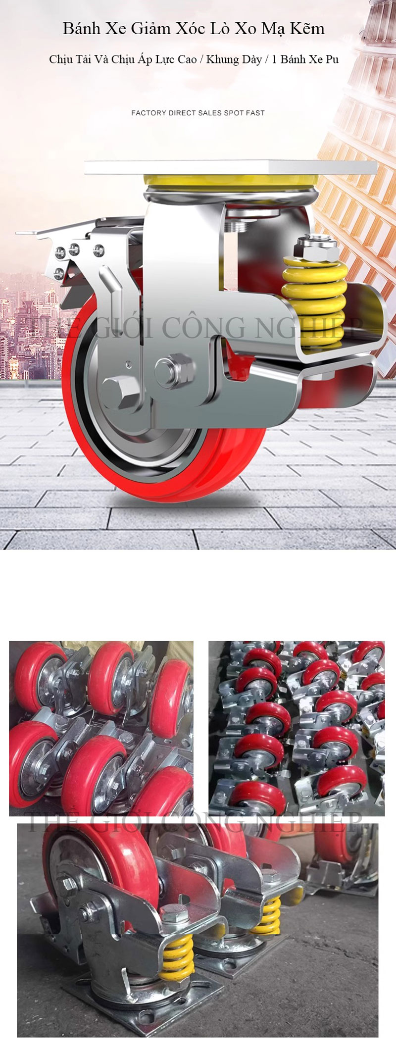 Hệ thống giảm sóc tích hợp bên trong sử dụng lò xo thép đàn hồi cao hoặc đệm giảm chấn bằng cao su chịu lực. Lò xo được thiết kế đặc biệt để hấp thụ chấn động trong quá trình di chuyển, bảo vệ bánh xe và giảm thiểu tác động rung lắc lên hàng hóa. Ổ bi ở phần trục bánh được làm từ thép không gỉ, gia công chính xác để đảm bảo chuyển động mượt mà, giảm thiểu ma sát và kéo dài tuổi thọ bánh xe.