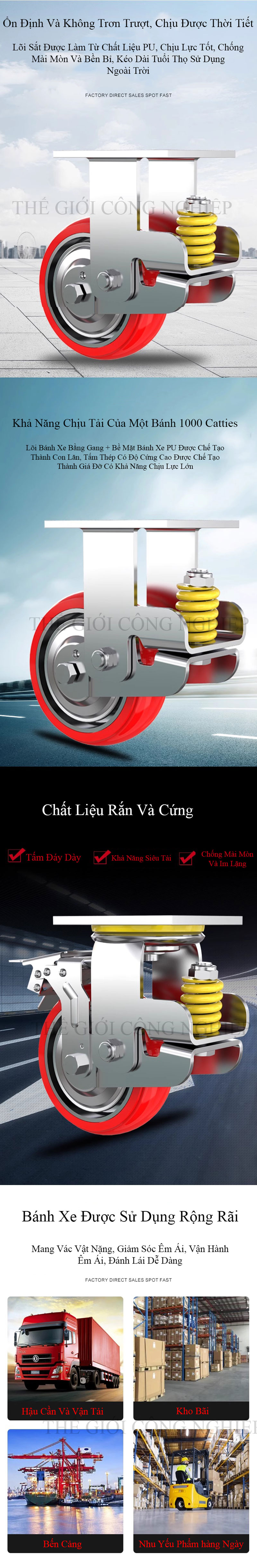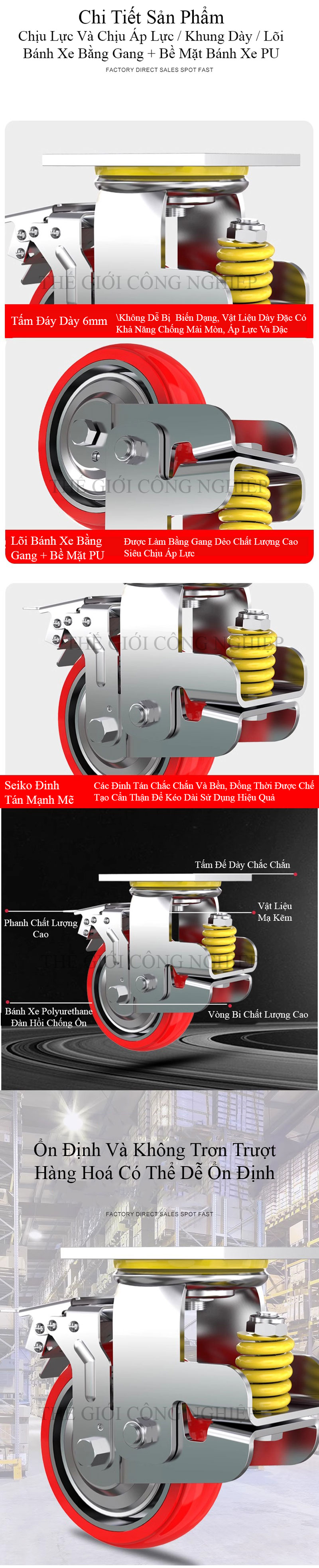- Chất liệu bề mặt bánh: PU chống mài mòn, hoặc cao su thiên nhiên tăng độ bám dính.