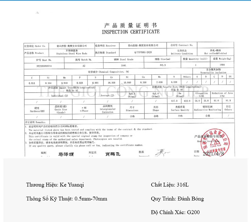 Sản phẩm được chế tạo từ thép không gỉ 316L (Inox 316L) – loại thép austenit cao cấp có thành phần molypden (Mo) tăng cường khả năng chống ăn mòn, chống oxy hóa và chịu axit mạnh, đặc biệt trong môi trường nước biển, hóa chất hoặc môi trường có tính ăn mòn cao.