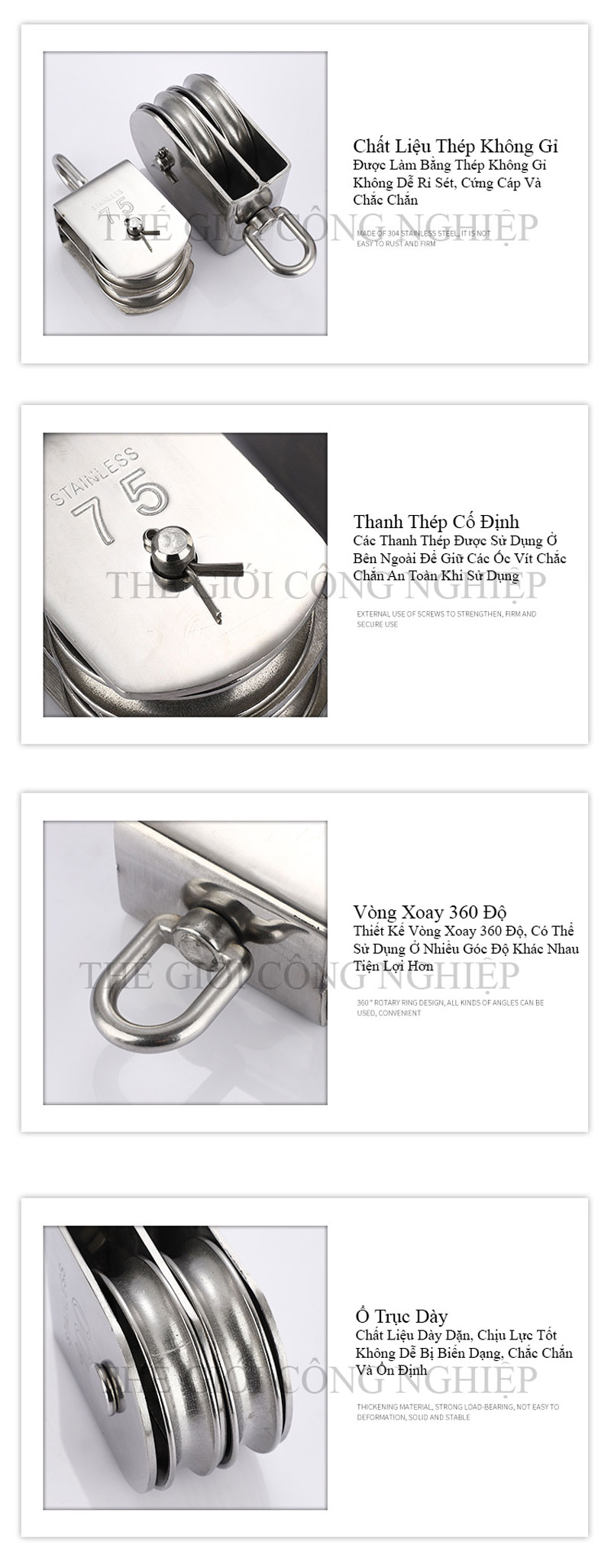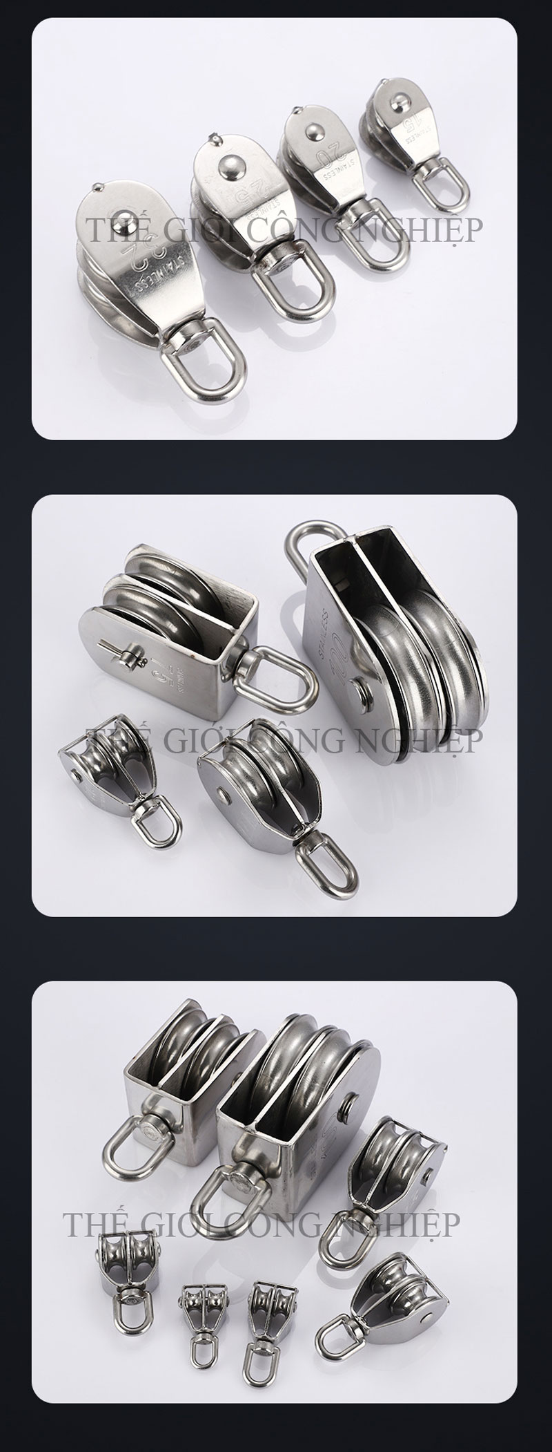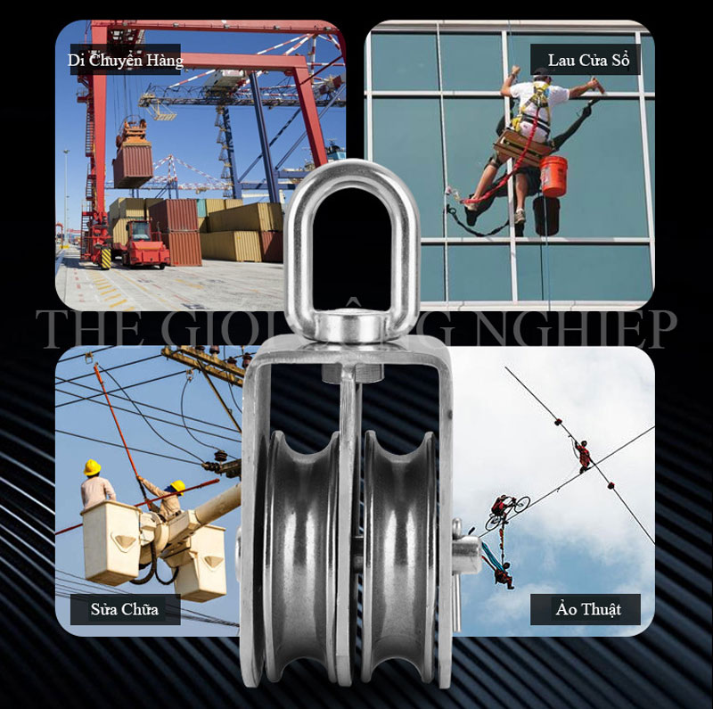 - Vật liệu từ thép không gỉ hoặc nylon công nghiệp siêu bền, giúp giảm ma sát và tăng tuổi thọ cho dây cáp.