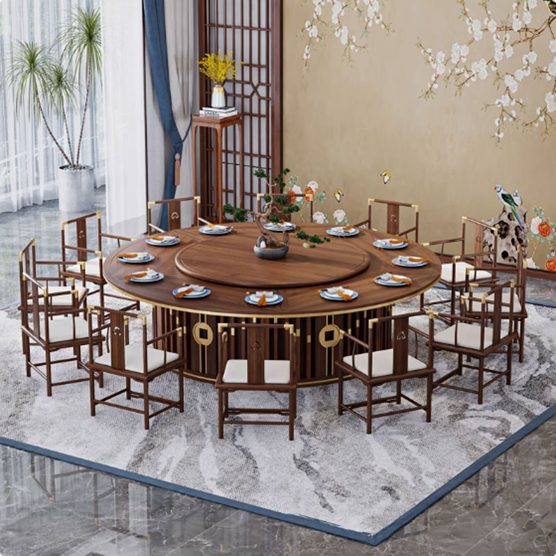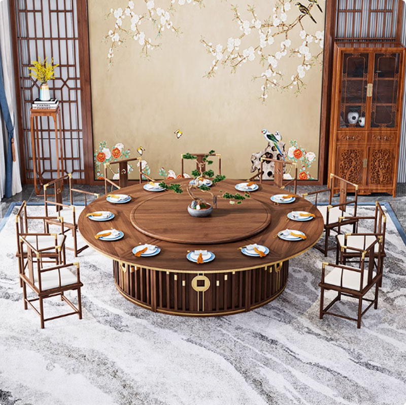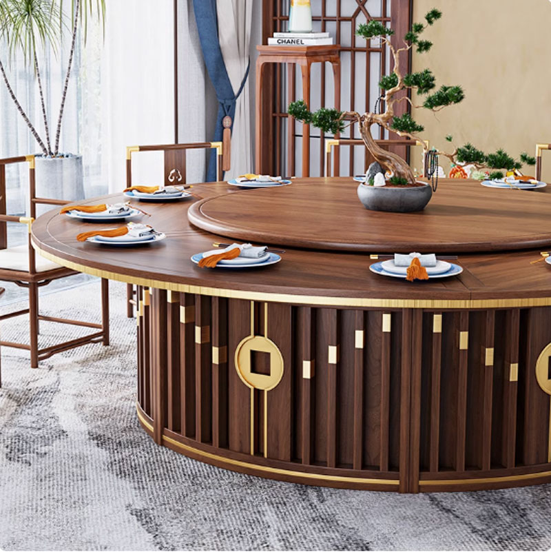 - Mặt bàn: Làm từ gỗ tự nhiên chất lượng cao (như gỗ óc chó, gỗ gõ đỏ hoặc gỗ hương), kết hợp với lớp kính cường lực sang trọng trên mâm xoay, chống trầy xước và chịu lực tốt.
