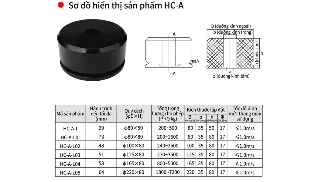 Khả năng hấp thụ xung lực vượt trội: Nhờ cấu trúc Polyurethane đàn hồi cao, bộ giảm chấn giúp triệt tiêu lực va đập mạnh khi cabin chạm điểm cuối hành trình, từ đó giảm thiểu tối đa rủi ro hư hỏng và tăng độ an toàn cho toàn hệ thống thang máy.