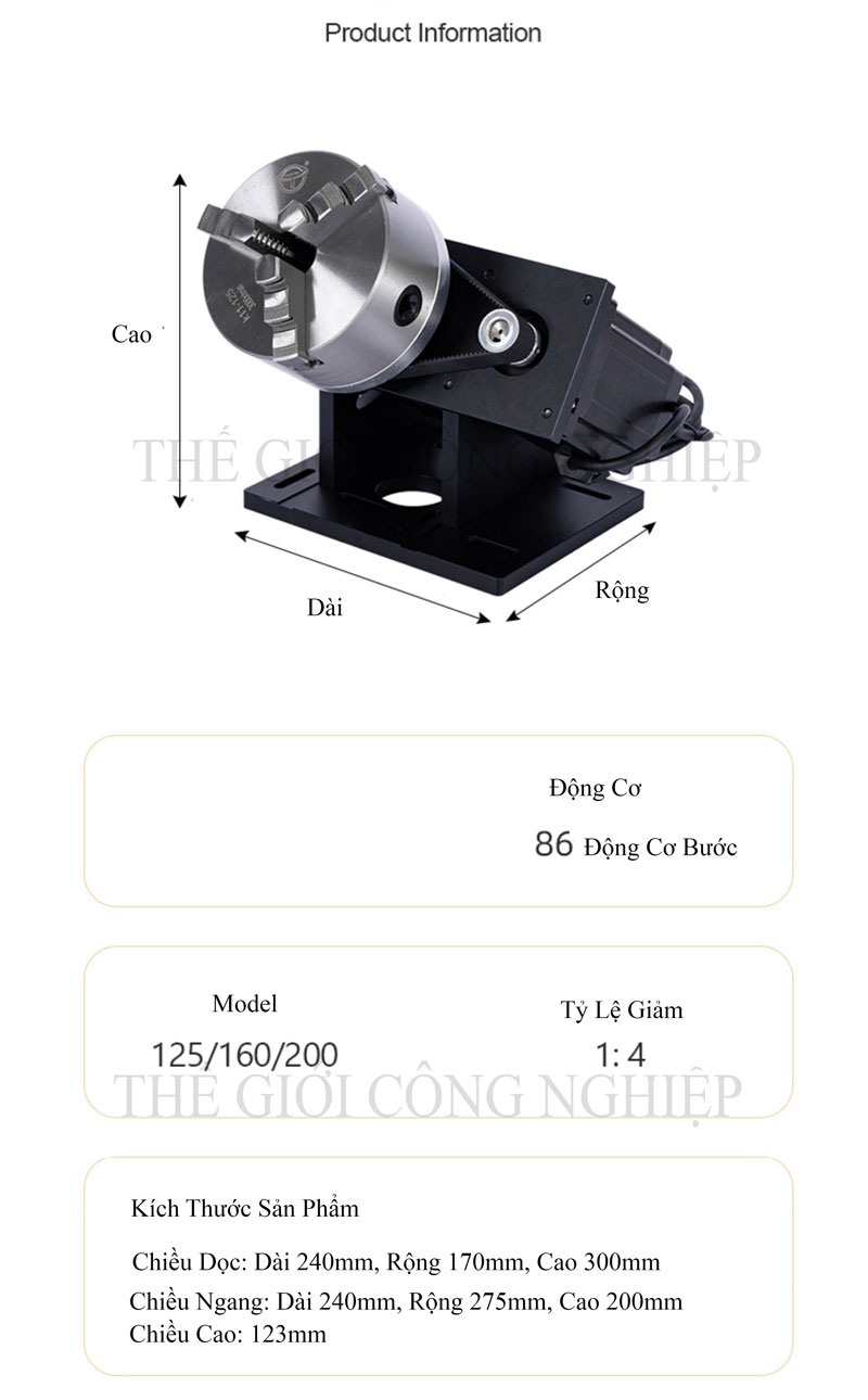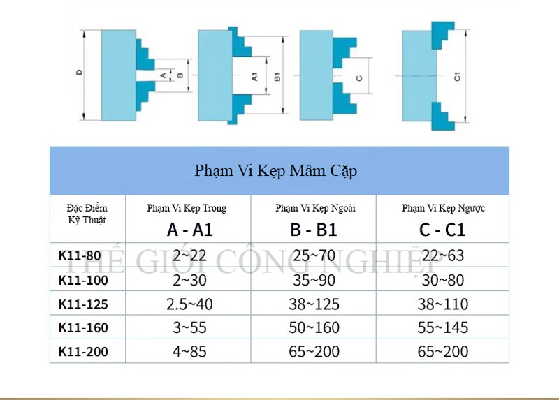 Bộ sản phẩm có nhiều kích cỡ phổ biến: đường kính 125 mm, 160 mm và 200 mm (tương ứng 5 inch, 6 inch và 8 inch), phù hợp với nhiều loại máy móc và nhu cầu gia công khác nhau. Nhờ khả năng tương thích rộng, mâm cặp xoay tự động này được ứng dụng trong nhiều lĩnh vực như cơ khí chính xác, gia công khuôn mẫu, sản xuất linh kiện công nghiệp và các dây chuyền tự động hóa.