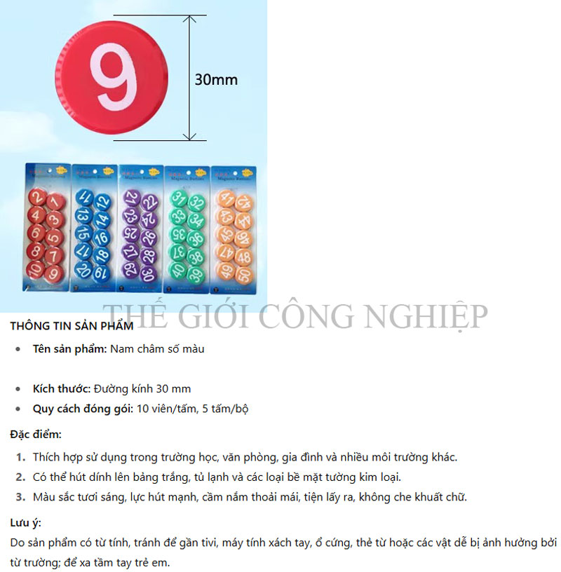 Sản phẩm có màu sắc tươi sáng (đỏ, cam, vàng, xanh, tím…) giúp phân biệt nhóm số hoặc hỗ trợ hoạt động học tập. Các viên nam châm nhẹ, viền bo tròn mềm mại, thuận tiện cho trẻ em cầm nắm, xếp đặt mà không gây nguy hiểm. Lực hút đủ mạnh để giữ 4–6 tờ giấy A4 hoặc thẻ học liệu mà không bị rơi.