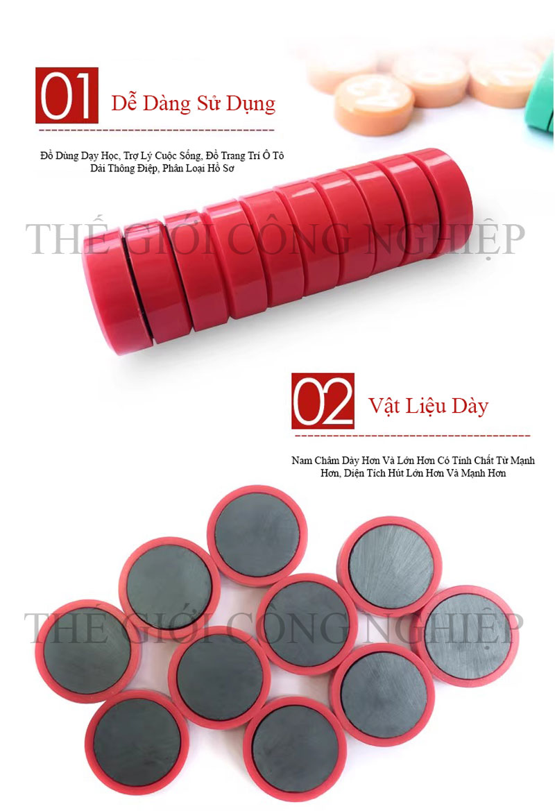 Bộ nam châm số tròn màu 1–100 được chế tạo từ lõi nam châm vĩnh cửu có từ lực ổn định, bọc ngoài bằng nhựa ABS cao cấp chống nứt vỡ, chống phai màu và an toàn cho người sử dụng. Đường kính mỗi viên 30 mm, mặt trước in số từ 1 đến 100 bằng công nghệ in UV sắc nét, khó bong tróc, dễ quan sát từ xa. Mặt sau được gắn lớp nam châm từ hóa hướng trục, tạo lực hút mạnh và đồng đều, bám chắc trên bề mặt kim loại như bảng từ, bảng trắng, tủ lạnh, kệ thép… mà không làm trầy xước.