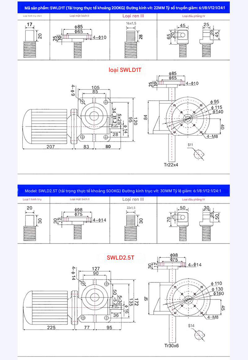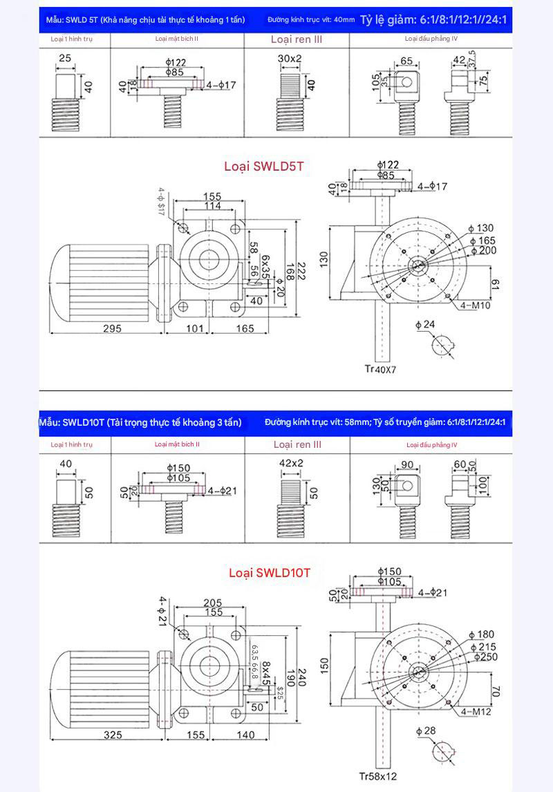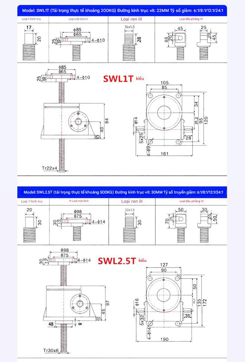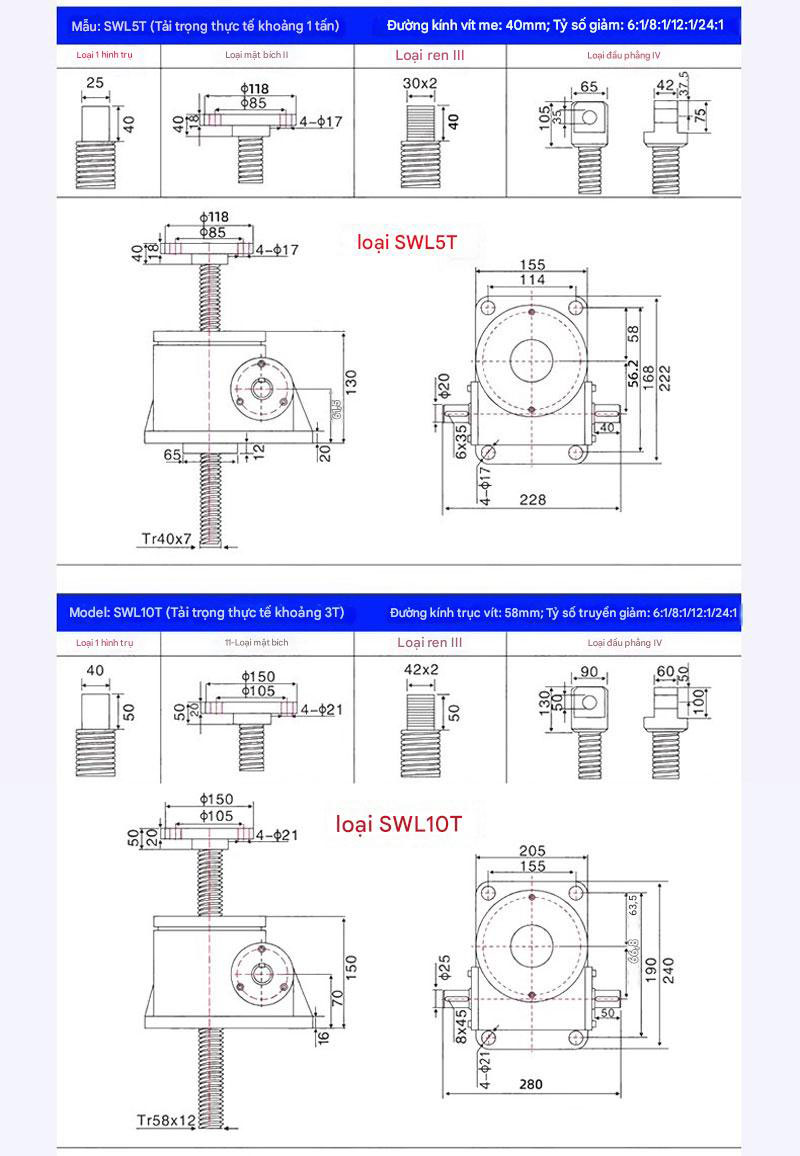 Mô tả chi tiết – Bộ nâng hạ trục vít me SWL dùng kết hợp nâng tay hoặc động cơ điện