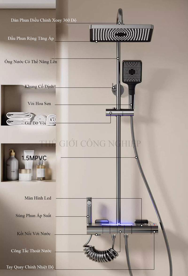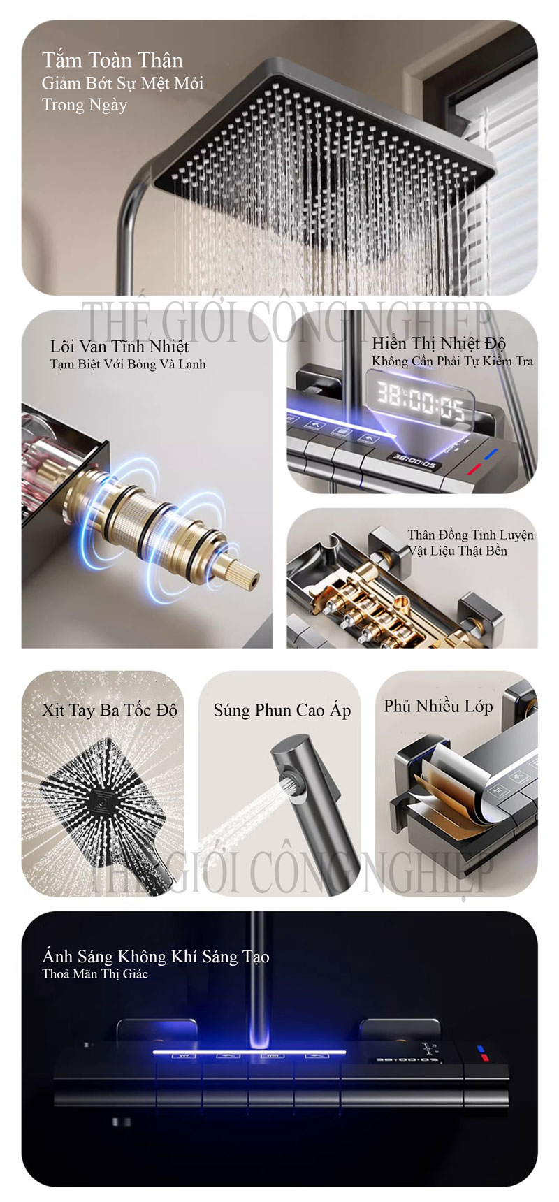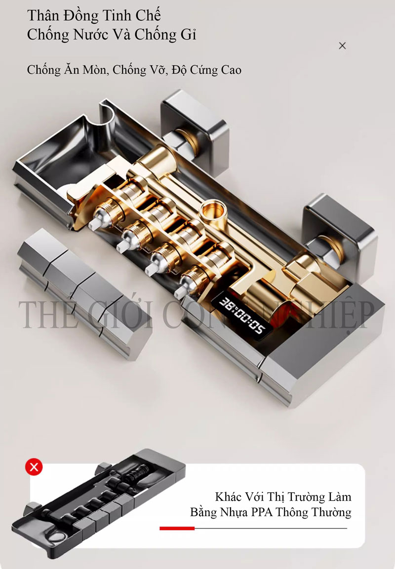 - Chất liệu: Đồng thau phủ PVD, inox 304, ABS chịu nhiệt.