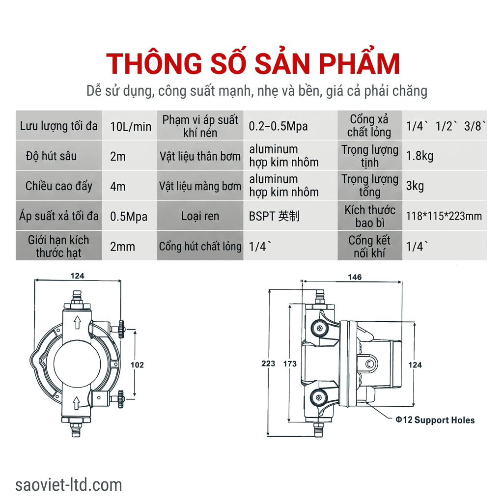 - Vật liệu bền bỉ: Thân bơm và màng bơm làm từ vật liệu chịu mài mòn, chịu hóa chất tốt như PTFE, NBR hoặc hợp kim nhôm .
