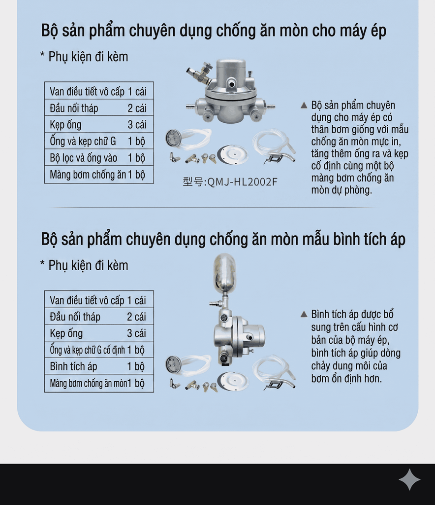 Bơm màng khí nén HL2002 là dòng bơm công nghiệp chuyên dụng sử dụng khí nén để vận hành, được thiết kế tối ưu cho các ứng dụng bơm mực in thùng carton, bơm keo và các chất lỏng có độ nhớt cao trong ngành sản xuất bao bì và ống giấy.