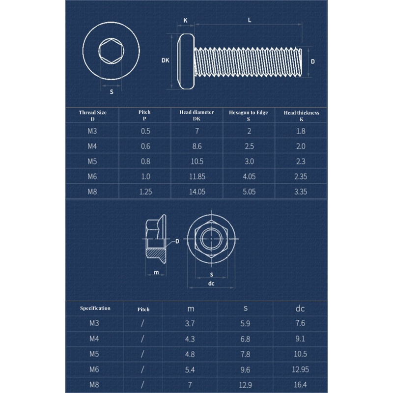 Bảng Thông Số Kỹ Thuật Bu Lông Lục Giác Vát Mép Có Đai Ốc Khoá M3 M4 M5: