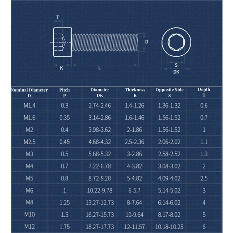 Bảng Thông Số Kỹ Thuật Bu Lông Lục Giác Đầu Chìm m4 m5 m6 m8 m10 m12: