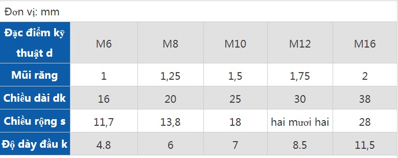 BẢNG THÔNG SỐ KỸ THUẬT Ê CU ĐẦU BÚA CHỮ T VẬT LIỆU INOX CHỐNG GỈ