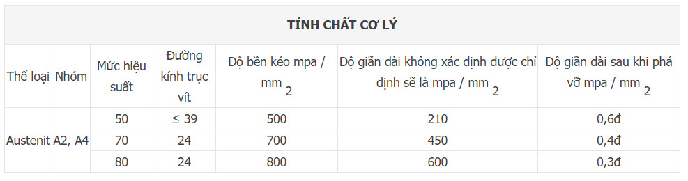 BẢNG TÍNH CHẤT CƠ LÝ INOX