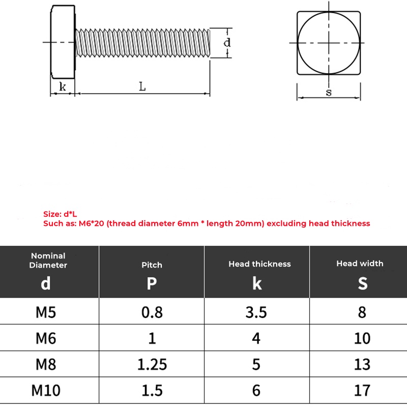 Bảng Thông Số Kỹ Thuật Bu Lông Vuông M4 m5 m6 m8:
