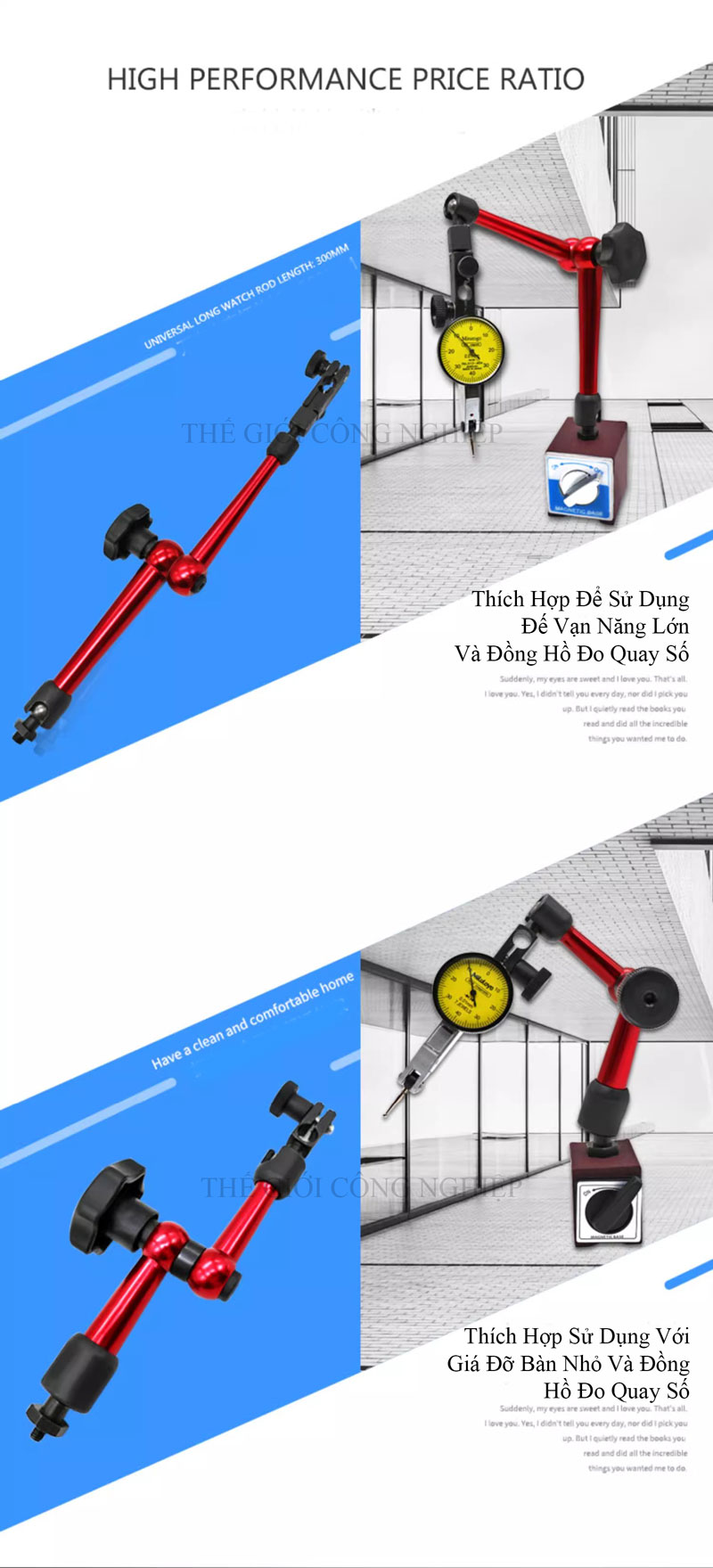 Chất liệu: Hợp kim thép + nhựa kỹ thuật (cần gá), thép cứng (đế từ)