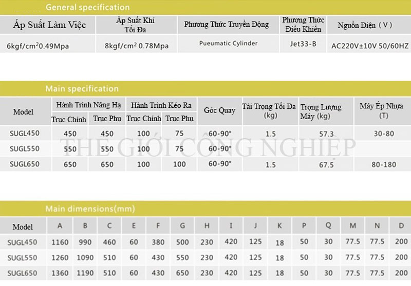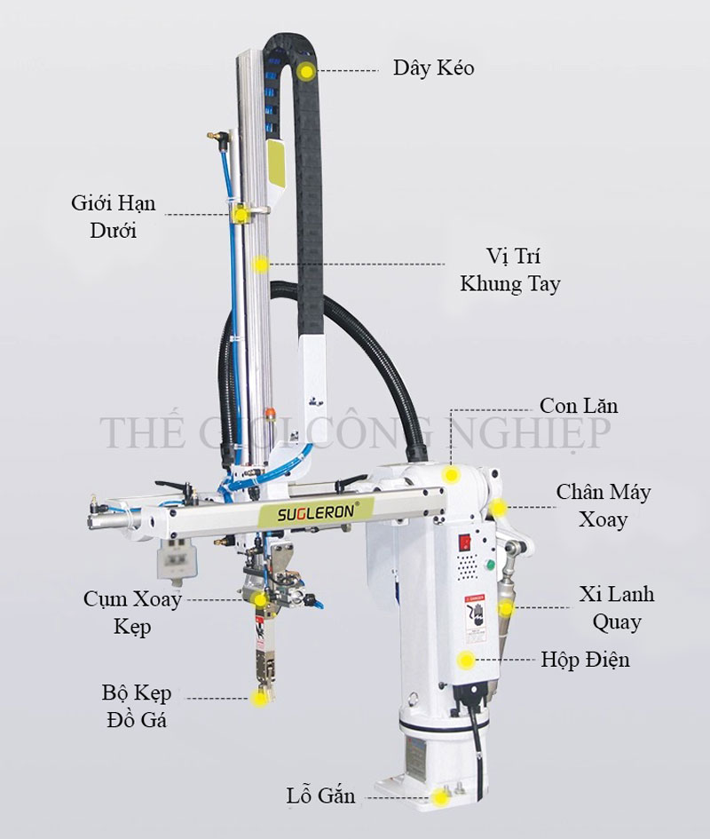 Robot được lắp đặt dạng treo, kết hợp cơ cấu gắp ngang, đảm bảo khả năng tiếp cận linh hoạt với nhiều loại khuôn ép khác nhau, kể cả trong không gian hẹp. Hệ thống truyền động bằng xy lanh khí nén, kết hợp điều khiển thông minh, cho phép cài đặt dễ dàng và vận hành ổn định. Các bộ phận chính như cơ cấu xoay, kẹp sản phẩm, giá đỡ và hộp điều khiển đều được chế tạo từ vật liệu bền bỉ, chống mài mòn, đảm bảo độ chính xác cao trong thời gian dài sử dụng.