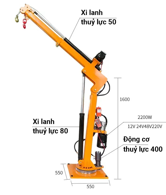 Phần cần cẩu telescopic được thiết kế dạng nhiều đoạn trượt lồng vào nhau, cho phép điều chỉnh chiều dài cần nâng tùy theo khoảng cách làm việc. Nhờ cơ cấu này, người dùng có thể linh hoạt thay đổi tầm với của cần cẩu, phù hợp với nhiều loại công việc nâng hạ khác nhau, từ các chi tiết máy nhỏ đến các thiết bị có trọng lượng lớn.