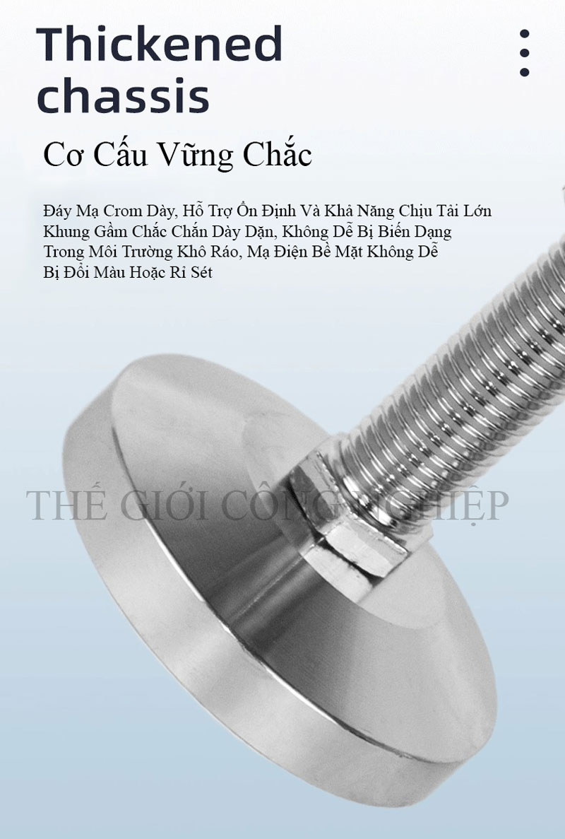 Chân đế máy WAD83-D80 loại nặng là phụ kiện chuyên dụng dùng để nâng đỡ, cố định và cân bằng máy móc công nghiệp có trọng tải lớn. Sản phẩm được thiết kế với kết cấu chắc chắn, bề mặt rãnh chống trượt, khả năng điều chỉnh độ cao linh hoạt và được mạ crôm sáng bóng giúp chống ăn mòn hiệu quả trong môi trường ẩm hoặc nhiều dầu mỡ.