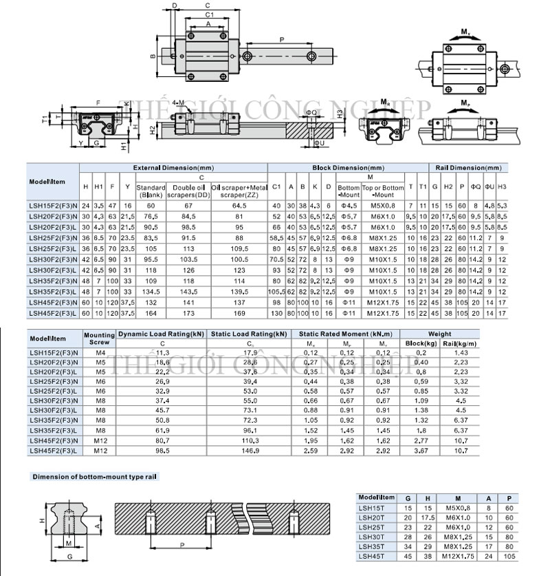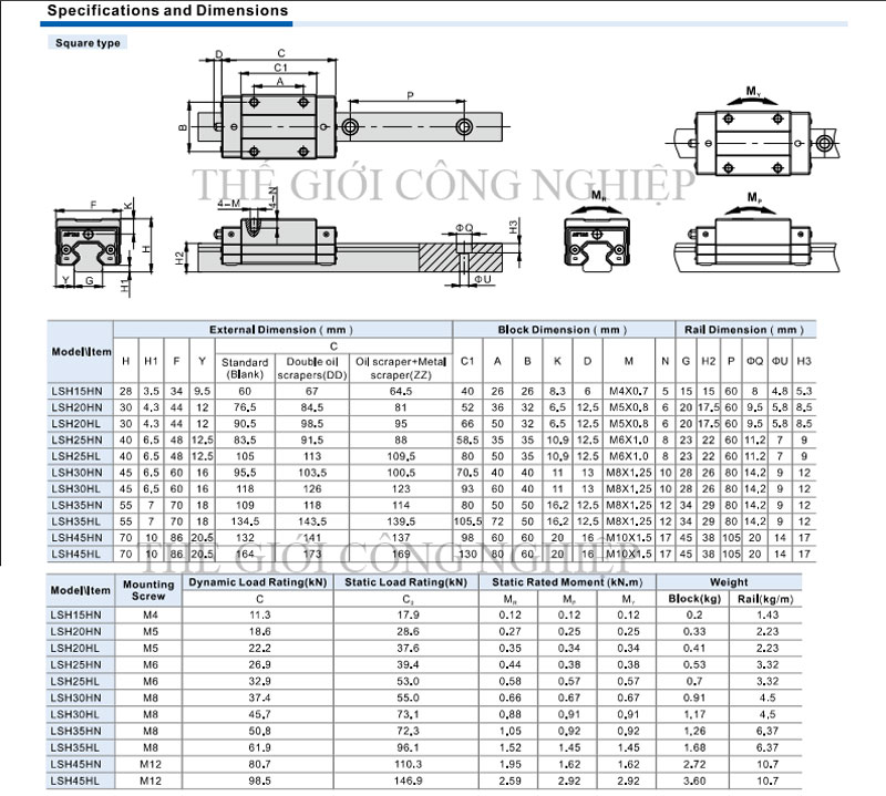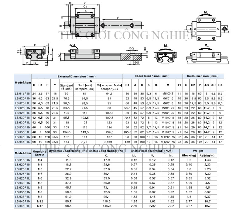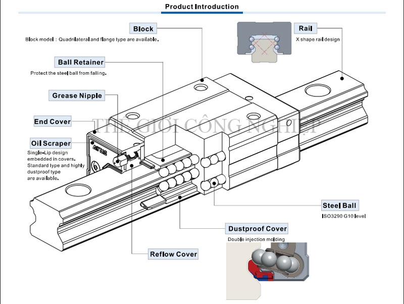 Sản phẩm được chế tạo từ thép hợp kim tôi cứng với độ cứng cao, bề mặt được mạ chống gỉ, chống mài mòn, giúp duy trì độ chính xác lâu dài ngay cả khi làm việc trong môi trường có bụi, dầu hoặc độ ẩm cao. Hệ thống bi tuần hoàn kép được bố trí đều xung quanh rãnh trượt, cho phép con trượt phân bố tải trọng đồng đều theo cả bốn hướng (trên, dưới, trái, phải). Nhờ đó, con trượt có thể chịu tải trọng hướng tâm, tải trọng mô-men và tải trọng kết hợp một cách hiệu quả.