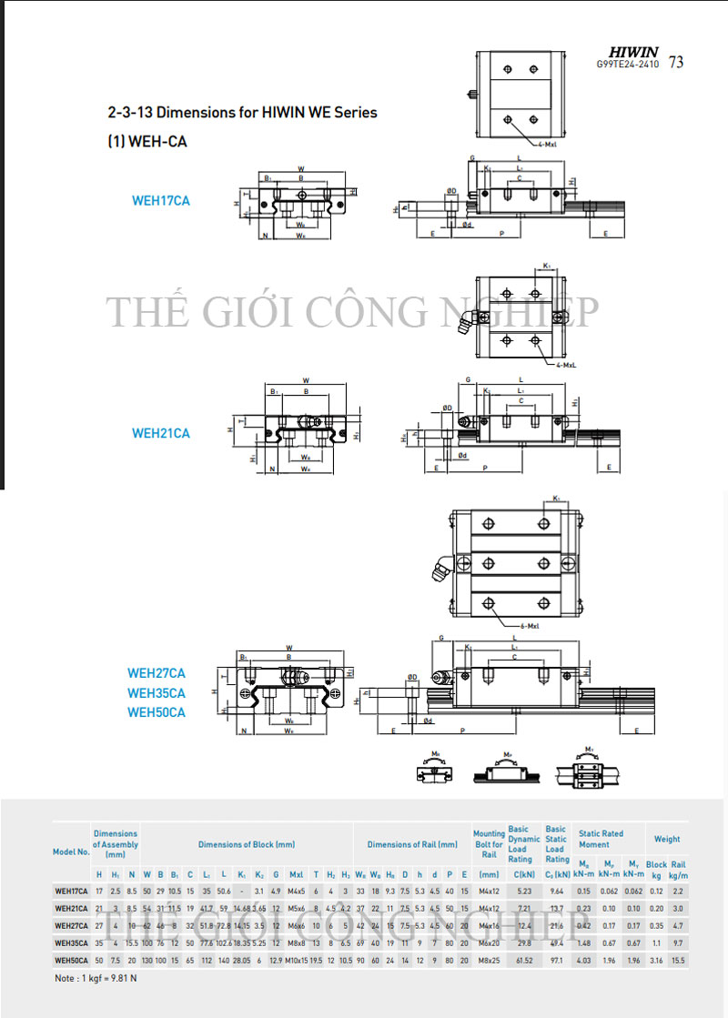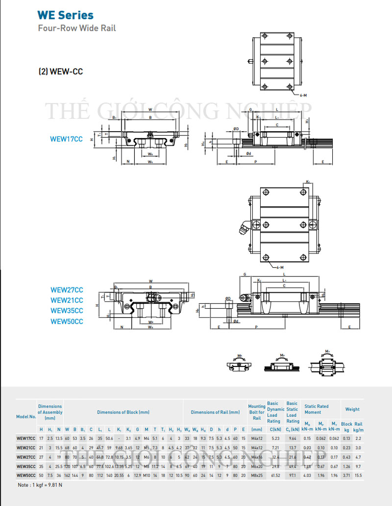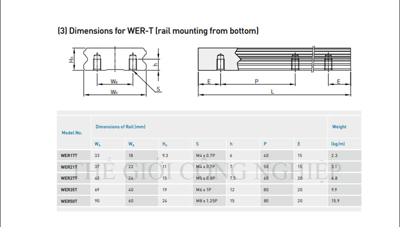 Các mã số như WE17, WE21, WE27, WE35 chỉ chiều rộng và chiều cao con trượt và ray. Mỗi mã tương ứng với công suất tải và kích thước khác nhau. -